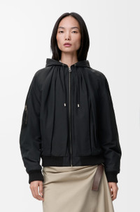 Hooded jacket in lightweight technical cotton blend featuring gathering at the front and back and quilted leather backing at the placket. - Regular fit, regular length - Hooded collar - Zip front fastening with Puzzle puller - Zipped utility pocket on the left sleeve, snap button diagonal welt pockets - Rib knit cuffs and hem - LOEWE Anagram embossed patch placed on the hood Colour: Black Main material: Cotton/polyamide Weight: 0.78 kg Made in: Italy Materials & care Main Material: 60% cotton 40% polyamide