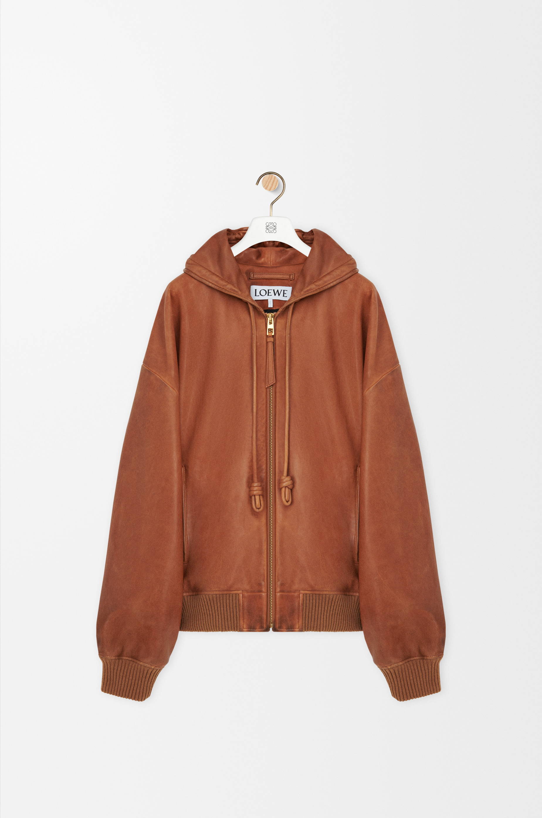 Jacket in lightweight vintage-effect nappa lambskin featuring a hooded collar with a Flamenco-inspired drawstring. - Relaxed fit, regular length - Zip front fastening - Rib knit cuffs and hem - Zipped welt pockets, inside welt pocket - Fully lined - LOEWE Anagram embossed leather patch placed on the hood Colour: Tan Main material: Nappa Weight: 1.7 kg Made in: Italy Materials & care Main Material: 100% lambskin