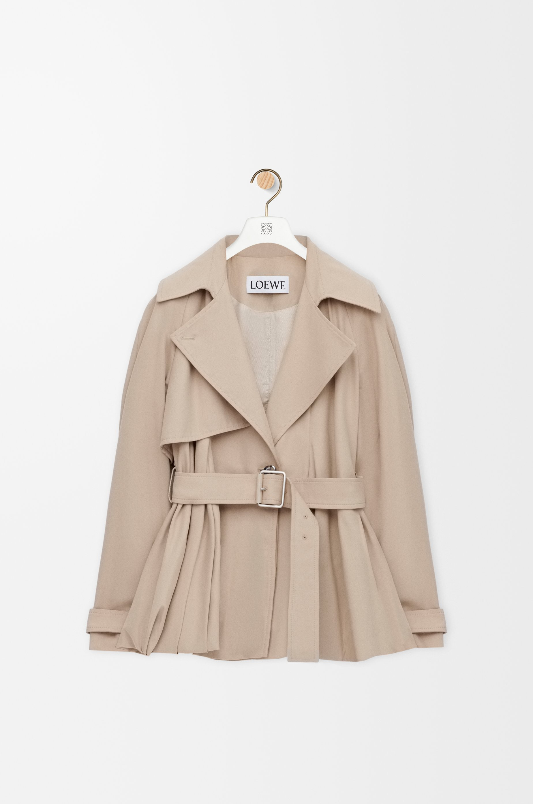Jacket in lightweight cotton gabardine featuring a balloon silhouette with an adjustable drawstring hem and a storm flap. - Regular fit, regular length - Peak lapel - Button front fastening, removable belt, belted cuffs - Seam pockets, inside welt pocket - Fully lined - LOEWE Anagram embossed leather patch placed at the back Colour: Beige Main material: Cotton Weight: 1.1 kg Made in: Italy Materials & care Main Material: 100% cotton