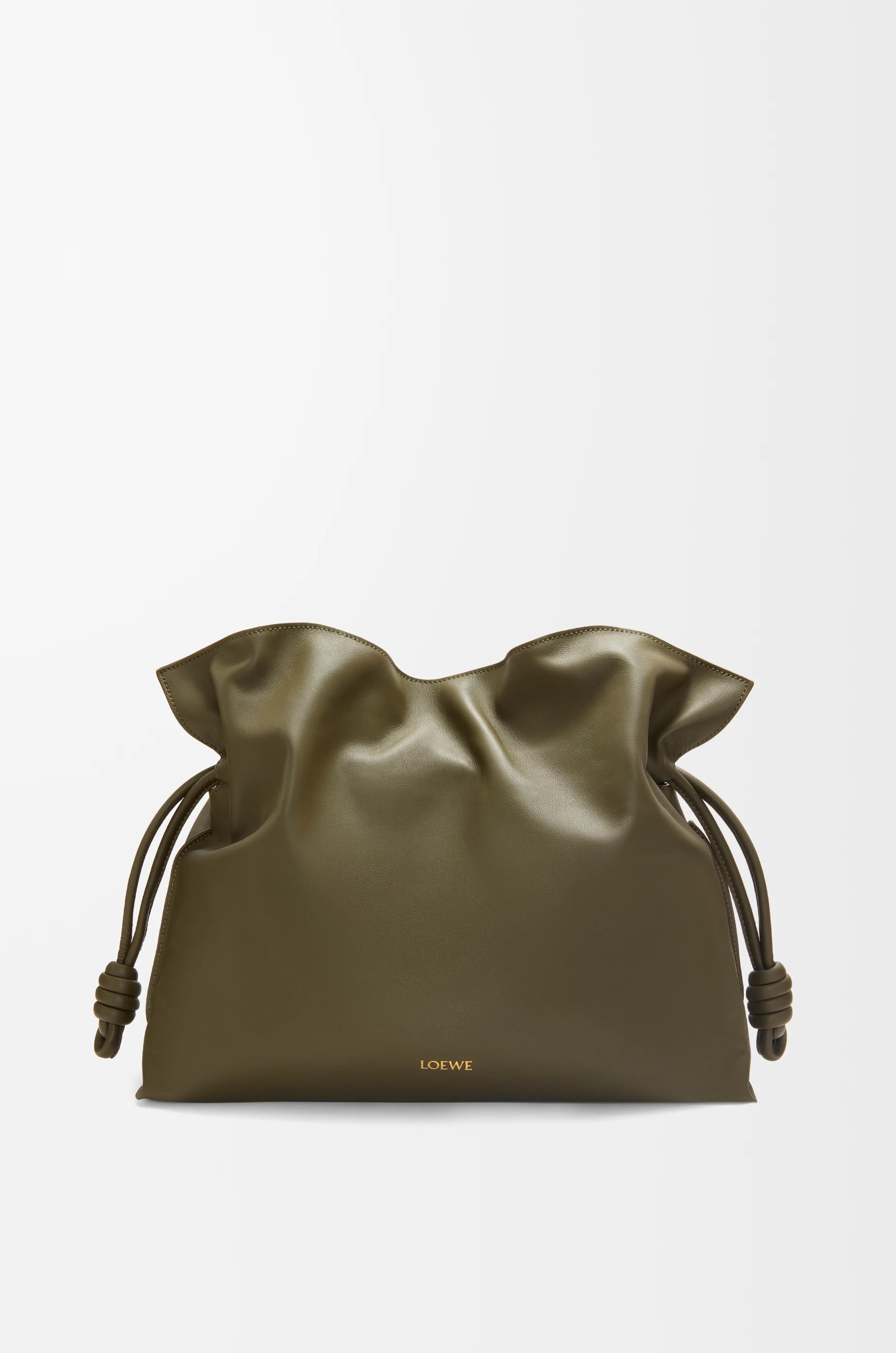 Launched in the 1980s, the Flamenco cinches closed using drawstring pulls finished in its signature coiled knots. This large version is crafted in nappa calfskin. - Shoulder carry - Calfskin top handles - Discreet magnetic closure - One interior zipped pocket - Herringbone cotton canvas lining - Gold or silver LOEWE embossed Details - Colour: Dark Khaki Green - Metallic colour: Gold - Main material: Nappa Calf - Handle drop: 29 cm - Weight: 0.64 kg - Height (cm): 29 - Width (cm): 38 - Depth (cm): 14 - Height (inch): 11.4 - Width (inch): 15 - Depth (inch): 5.5 - Model ID: A411FL1X18 - CIL: 0011034618 - Made in: Spain
