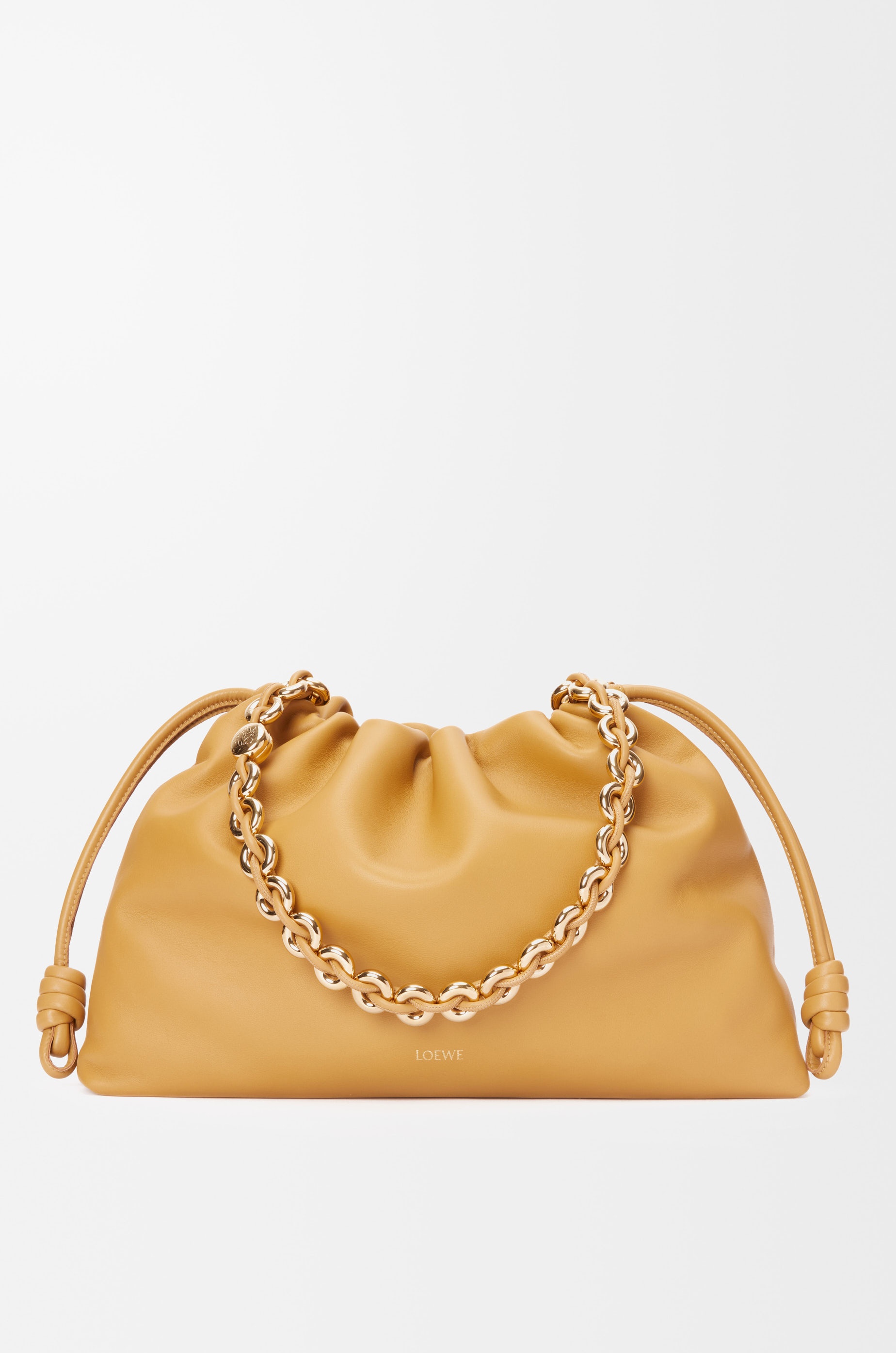The Flamenco Purse is defined by a ruched design inspired by the Flamenco line's aesthetics, with key details such as the signature knots at the sides and the donut chain, reworked here with thicker proportions. This large version is crafted in mellow nappa lambskin. - Shoulder, crossbody or hand carry - Detachable and adjustable leather strap - Detachable donut chain adorned with an Anagram Pebble - Discreet magnetic closure - Suede lining - Gold or silver embossed LOEWE Details - Colour : Sahara - Metallic colour : Gold - Main material : Mellow Nappa Lambskin - Strap length : 74/ 78 - 139 cm - Strap drop : 33/ 40 - 72 cm - Handle drop : 33 cm - Weight : 0.65 kg - Height (cm) : 26 - Width (cm) : 41 - Depth (cm) : 9 - Height (inch) : 10.2 - Width (inch) : 16.1 - Depth (inch) : 3.5 - Model ID : A411FPDX01 - CIL : - 0011182227 - Made in : Spain