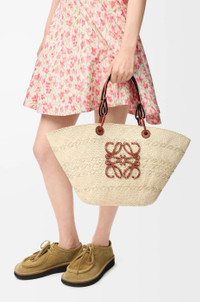 The Anagram Basket is a traditional bag featuring a classic handwoven body, tubular calfskin straps and top handles, as well as an embroidered calfskin Anagram. This medium version is made in Spain using iraca palm leaves that have been cultivated, harvested, sun-dried and handwoven by artisans in Colombia. - Shoulder or top handle carry - Calfskin tie closure - Due to its handcrafted nature, sizes may differ slightly, making every item unique. Colour: Natural/Tan Main material: Iraca palm/calf Handle drop: 15 - 30 cm Weight: 0.26 kg Height: 24.5 cm Width: 46 cm Depth: 16 cm Made in: Portugal