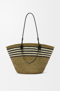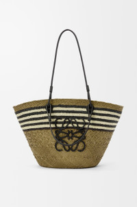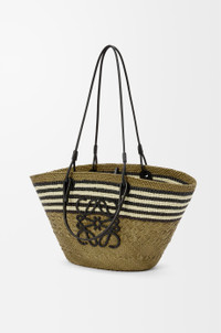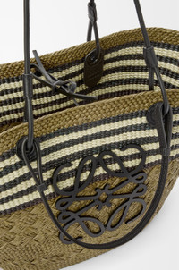 The Anagram basket has a classic lightweight body with tubular calfskin straps and an embroidered calfskin Anagram. This medium striped version is made in Spain using mixed colour iraca palm leaves cultivated and handwoven by artisans in Colombia. - Shoulder or hand carry - Top handles - Calfskin tie closure - Due to its handcrafted nature, sizes may differ slightly, making every item unique. Colour: Dark Khaki/Black Main material: Iraca Palm/Calf Handle drop: 15 - 30 cm Weight: 0.35 kg Height: 24.5 cm Width: 46 cm Depth: 16 cm Made in: Spain