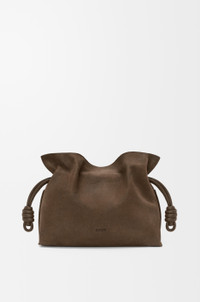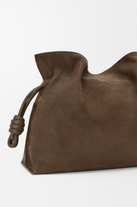 The Flamenco clutch is a soft and slouchy bag with a cinched closure and historical knot drawstrings. This medium version is crafted in grained nubuck. - Shoulder, crossbody or hand carry - Detachable and adjustable strap - Discreet magnetic closure - Nappa lambskin lining - Embossed LOEWE Colour: Tundra Metallic colour: Palladium Main material: Grained nubuck Strap length: 96 - 120 cm Strap drop: 38 - 44 cm Weight: 0.43 kg Height: 24.5 cm Width: 30 cm Depth: 10.5 cm Made in: Spain