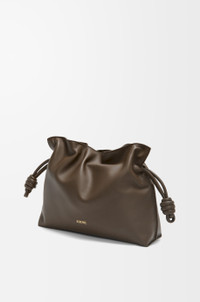 The Flamenco clutch is a soft and slouchy bag with a cinched closure and historical knot drawstrings. This medium version is crafted in nappa calfskin. - Shoulder, crossbody or hand carry - Detachable and adjustable strap - Magnetic closure - Suede lining - Gold or silver embossed LOEWE Colour: Chocolate Metallic colour: Gold Main material: Nappa Calf Strap length: 96-120 cm Strap drop: 38 - 44 cm Weight: 0.5 kg Height: 24.5 cm Width: 30 cm Depth: 10.5 cm Made in: Spain