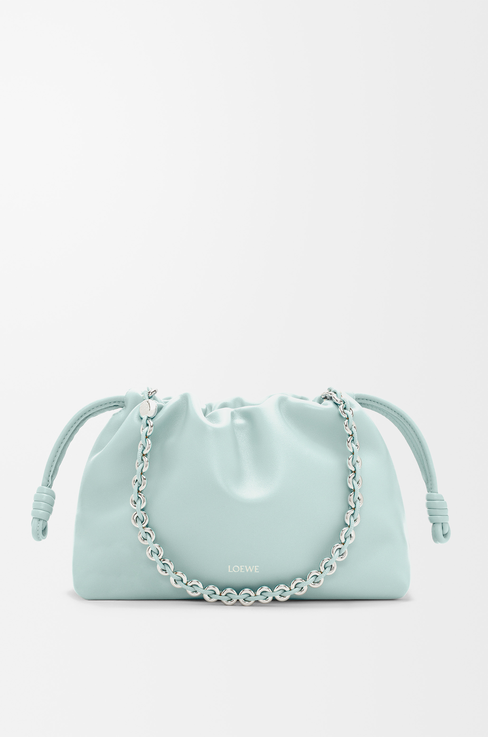 The Flamenco purse is a lightweight and soft bag with a ruched shape, historical knot drawstrings and a donut chain. This medium version is crafted in mellow nappa lambskin. - Shoulder, crossbody or hand carry - Detachable donut chain with Anagram Pebble - Detachable and adjustable leather strap - Magnetic closure - Suede lining - Gold or silver embossed LOEWE Colour: Frozen Metallic colour: Palladium Main material: Mellow Nappa Lambskin Strap length: 59 / 82 - 142 cm Strap drop: 27 / 37 - 67 cm Weight: 0.31 kg Height: 20 cm Width: 30 cm Depth: 10.5 cm Made in: Spain