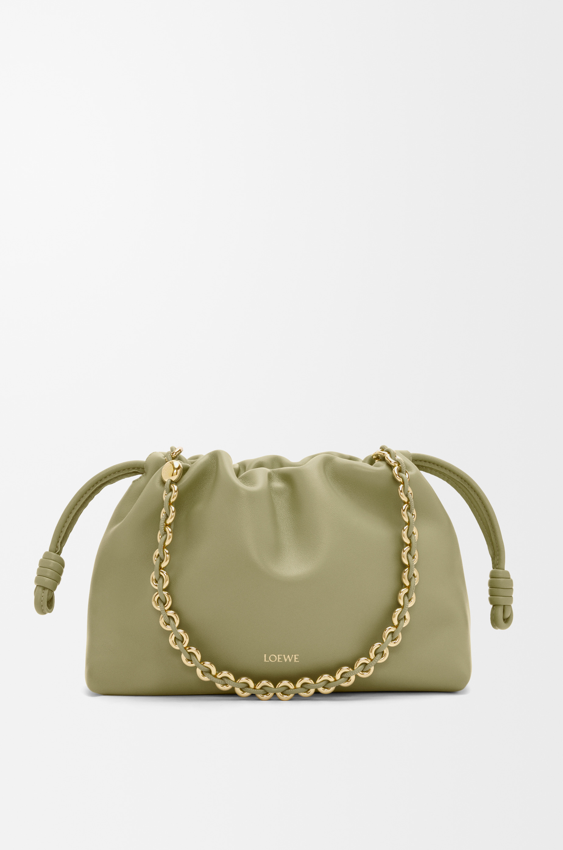 The Flamenco purse is a lightweight and soft bag with a ruched shape, historical knot drawstrings and a donut chain. This medium version is crafted in mellow nappa lambskin. - Shoulder, crossbody or hand carry - Detachable donut chain with Anagram Pebble - Detachable and adjustable leather strap - Magnetic closure - Suede lining - Gold or silver embossed LOEWE Colour: Light Moss Metallic colour: Gold Main material: Mellow Nappa Lambskin Strap length: 59 / 82 - 142 cm Strap drop: 27 / 37 - 67 cm Weight: 0.31 kg Height: 20 cm Width: 30 cm Depth: 10.5 cm Made in: Spain