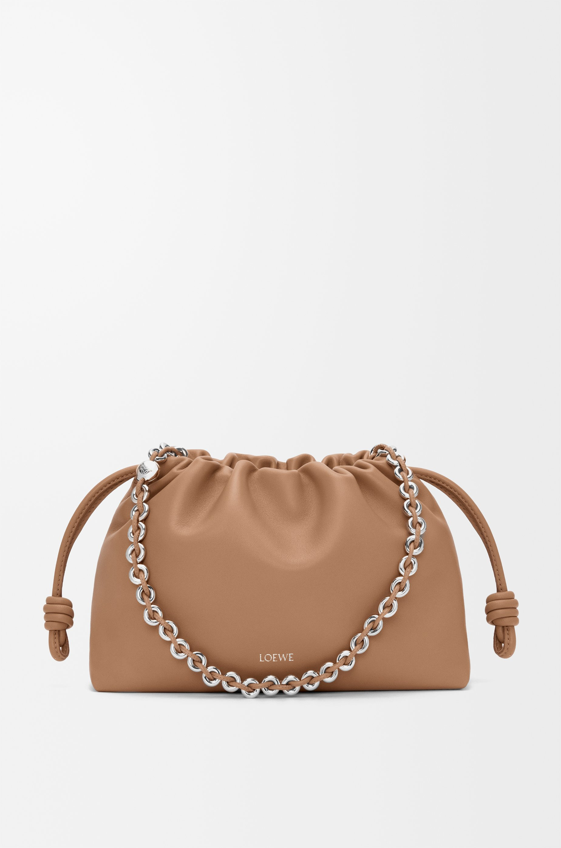 The Flamenco purse is a lightweight and soft bag with a ruched shape, historical knot drawstrings and a donut chain. This medium version is crafted in mellow nappa lambskin. - Shoulder, crossbody or hand carry - Detachable donut chain with Anagram Pebble - Detachable and adjustable leather strap - Magnetic closure - Suede lining - Gold or silver embossed LOEWE Colour: Mocha Metallic colour: Palladium Main material: Mellow Nappa Lambskin Strap length: 59 / 82 - 142 cm Strap drop: 27 / 37 - 67 cm Weight: 0.31 kg Height: 20 cm Width: 30 cm Depth: 10.5 cm Made in: Spain