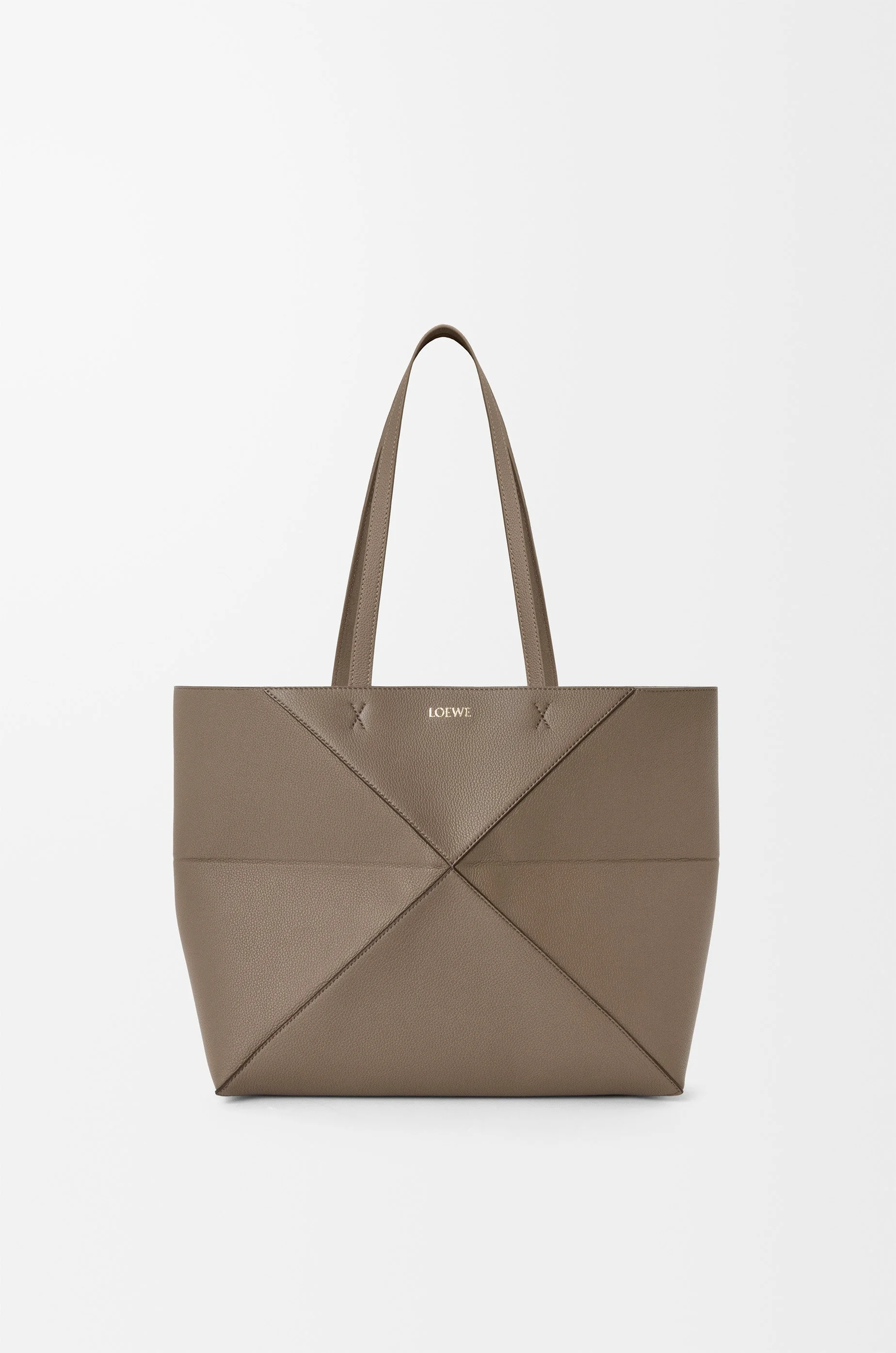 The Puzzle Fold's lightweight geometric structure is designed to fold completely flat, making it a perfect tote to travel with. This medium horizontal version is crafted in soft grained calfskin. - Shoulder or hand carry - Suede lining - Gold embossed LOEWE Colour: Taupe Metallic colour: Gold Main material: Soft Grained Calf Strap drop: 27 cm Handle drop: 27 cm Weight: 0.56 kg Height: 29 cm Width: 31.5 cm Depth: 12.5 cm Made in: Spain
