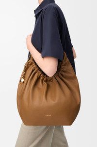 The Squeeze bag is a sophisticated and feminine bag in buttery nappa leather. It is a masterpiece of traditional craftsmanship, innovative research and distinctive design, with a surprisingly light ruched body, an adjustable donut chain and a tactile squeezy handle. This is a medium version in nappa lambskin. - Shoulder, crossbody or hand carry - Adjustable chain strap with Anagram engraved pebble and additional chain to extend the strap further - Magnetic closure - Internal zipped pocket - Unlined - Gold or silver LOEWE embossed Details - Colour: Oak - Metallic colour: Gold - Main material: Mellow Nappa Lambskin - Strap length: 45 - 81 cm - Handle drop: 24 - 42 cm - Weight: 0.72 kg - Height (cm): 33 - Width (cm): 34 - Depth (cm): 13.5 - Height (inch): 13 - Width (inch): 13.4 - Depth (inch): 5.3 - Model ID: A914Q37X01 - CIL: 0010947521 - Made in: Spain