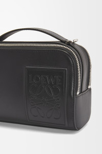 Versatile camera bag with two zipped compartments. This version is crafted in satin calfskin. - Crossbody or hand carry - Adjustable and detachable LOEWE webbing strap - Herringbone cotton canvas lining - Debossed LOEWE Anagram patch Colour: Black Metallic colour: Palladium Main material: Satin Calf Strap length: 75 - 128 cm Strap drop: 37 - 63 cm Weight: 0.33 kg Height: 13 cm Width: 18 cm Depth: 8.5 cm Made in: Spain
