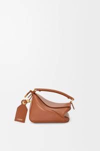 The Featherlight Puzzle is defined by its distinctive geometric lines and its cuboid form. The supple featherlight nappa makes the bag soft and slouchy. - Shoulder, crossbody or hand carry - Detachable and adjustable strap with rotating dogclips - Zip closure with articulated pull - Detachable LOEWE gold or silver embossed tag with secret pocket and balloon dice - Baguette-shaped metal feet - Nappa lambskin lining - Embossed Anagram, LOEWE engraved internal plaque Colour: Pecan Metallic colour: Gold Main material: Featherlight Nappa Lambskin Strap length: 91 - 111 cm Strap drop: 58 cm Handle drop: 4 cm Weight: 0.28 kg Height: 12.5 cm Width: 17.5 cm Depth: 7.5 cm Made in: Spain