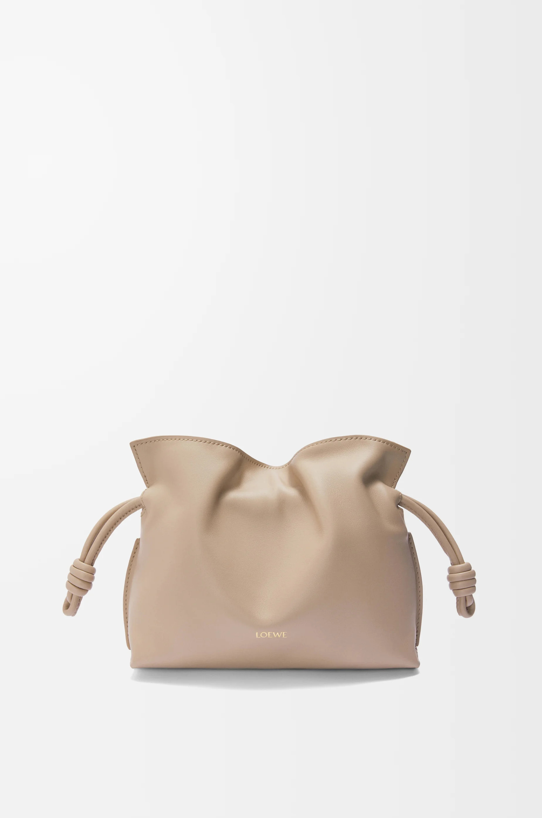 The Flamenco is an iconic design launched in the 1980s. It cinches closed using drawstring pulls finished in signature coiled knots. This mini version is crafted in nappa calfskin. - Shoulder, crossbody or hand carry - Detachable and adjustable strap - Magnetic closure - Suede lining - Gold or silver embossed LOEWE Details - Colour : Sand - Metallic colour : Gold - Main material : Nappa Calf - Strap length : 96 - 120 cm - Strap Drop : 36 - 49 cm - Weight : 0.3 kg - Height (cm) : 18 - Width (cm) : 23.9 - Depth (cm) : 9 - Height (inch) : 7.1 - Width (inch) : 9.4 - Depth (inch) : 3.5 - Model ID : A411FC2X73 - CIL : - 0011191020 - Made in : Spain