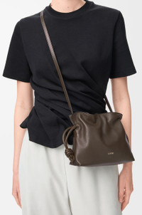 The Flamenco clutch is a soft and slouchy bag with a cinched closure and historical knot drawstrings. This mini version is crafted in nappa calfskin. - Shoulder, crossbody or hand carry - Detachable and adjustable strap - Magnetic closure - Suede lining - Gold or silver embossed LOEWE Colour: Chocolate Metallic colour: Gold Main material: Nappa Calf Strap length: 96-120 cm Strap drop: 36 - 49 cm Weight: 0.3 kg Height: 18 cm Width: 23.9 cm Depth: 9 cm Made in: Spain