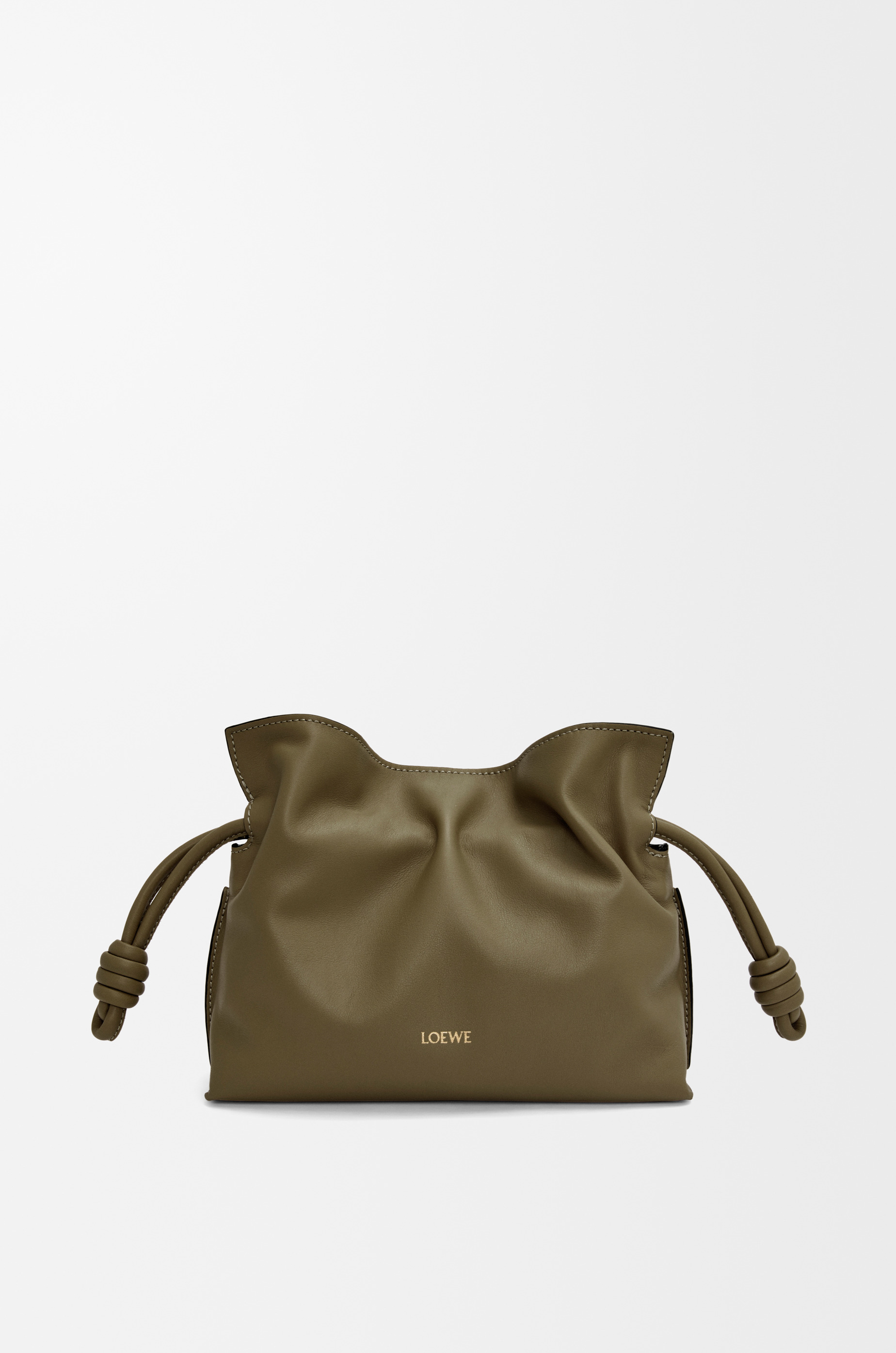 Launched in the 1980s, the Flamenco Clutch cinches closed using drawstring pulls finished in signature coiled knots. This mini version is crafted in nappa calfskin. - Shoulder, crossbody or hand carry - Detachable and adjustable strap - Discreet magnetic closure - Gold suede lining - Gold or silver LOEWE embossed Details - Colour: Dark Khaki Green - Metallic colour: Gold - Main material: Nappa Calf - Strap length: 96 - 120 cm - Weight: 0.3 kg - Height (cm): 18 - Width (cm): 23.9 - Depth (cm): 9 - Height (inch): 7.1 - Width (inch): 9.4 - Depth (inch): 3.5 - Model ID: A411FC2X73 - CIL: 0010965994 - Made in: Spain