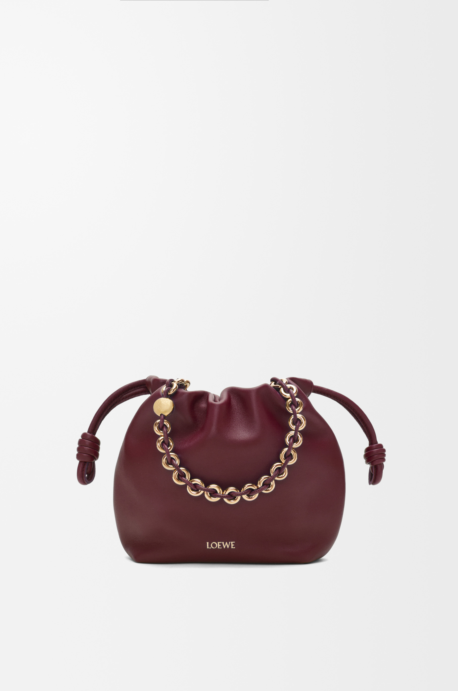 The sensual and mellow Flamenco Purse is defined by a ruched design complemented by key details such as the signature knots at the sides. Versatile and functional, it can be carried as a clutch, worn over the shoulder using the donut chain or crossbody with the accompanying leather strap. This version is crafted in mellow nappa lambskin. - Shoulder, crossbody or hand carry - Detachable and adjustable leather strap - Detachable donut chain adorned with Anagram engraved Pebble - Discreet magnetic closure - Suede lining - Gold or silver embossed LOEWE Details - Colour: Dark Burgundy - Metallic colour: Gold - Main material: Mellow Nappa Lambskin - Weight: 0.18 kg - Height (cm): 17 - Width (cm): 23 - Depth (cm): 5.5 - Height (inch): 6.7 - Width (inch): 9.1 - Depth (inch): 2.2 - Model ID: A914CBPX03 - CIL: 0010976835 - Made in: Spain