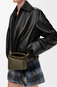 The Puzzle bag is the debut bag for LOEWE by Creative Director Jonathan Anderson. A cuboid shape and precise cutting technique create Puzzle’s distinctive geometric lines. This mini version is crafted in classic calfskin. - Shoulder, crossbody, top handle or clutch carry - Removable and adjustable shoulder strap - Zip closure with calfskin pull - Customisable with strap and personalisation charms - Herringbone cotton canvas lining - Embossed Anagram Details - Colour: Dark Khaki Green - Metallic colour: Gold - Main material: Classic Calf - Strap length: 108.5 - 137 cm - Handle drop: 4 cm - Weight: 0.24 kg - Height (cm): 12.5 - Width (cm): 18 - Depth (cm): 8 - Height (inch): 4.9 - Width (inch): 7.1 - Depth (inch): 3.1 - Model ID: A510P88X26 - CIL: 0011091527 - Made in: Spain