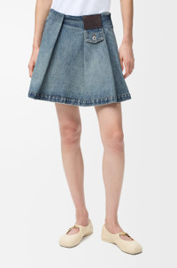 Skirt in medium-weight washed cotton denim featuring pleats at the front. - Regular fit, short length - Mid waist - Side zip fastening - Buttoned coin pocket, seam pockets, rear patch pocket - LOEWE embossed leather patch placed at the front Colour: Washed Denim Main material: Cotton Weight: 0.5 kg Made in: Italy Materials & care Main Material: 100% cotton