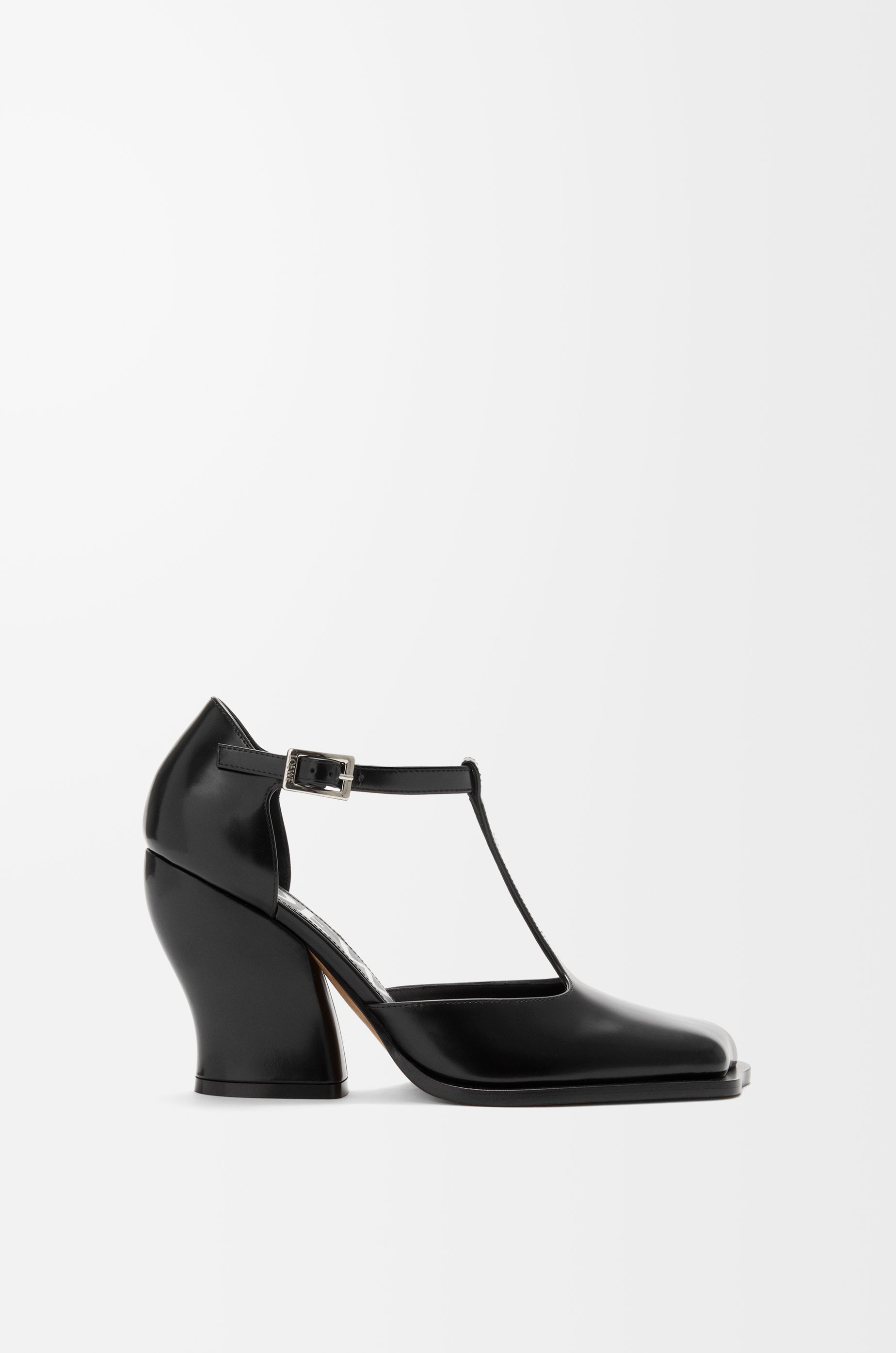 T-bar pump in brushed calfskin featuring an asymmetric wavy toe shape and the Onda chunky heel. - 90mm heel - LOEWE engraved adjustable buckle - Leather insole and outsole Colour: Black Main material: Brushed Calf Weight: 0.7 kg Made in: Italy
