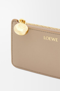Coin cardholder in shiny nappa calfskin featuring a signature Pebble zip pull. - Zipped coin compartment with Anagram engraved Pebble pull - Four card slots - Gold embossed LOEWE Details - Colour: Sand - Metallic colour: Gold - Main material: Shiny Nappa Calf - Weight: 0.05 kg - Height (cm): 7.5 - Width (cm): 13 - Depth (cm): 1 - Height (inch): 3 - Width (inch): 5.1 - Depth (inch): 0.4 - Model ID: CANBZ40X01 - CIL: 0011035482 - Made in: Spain