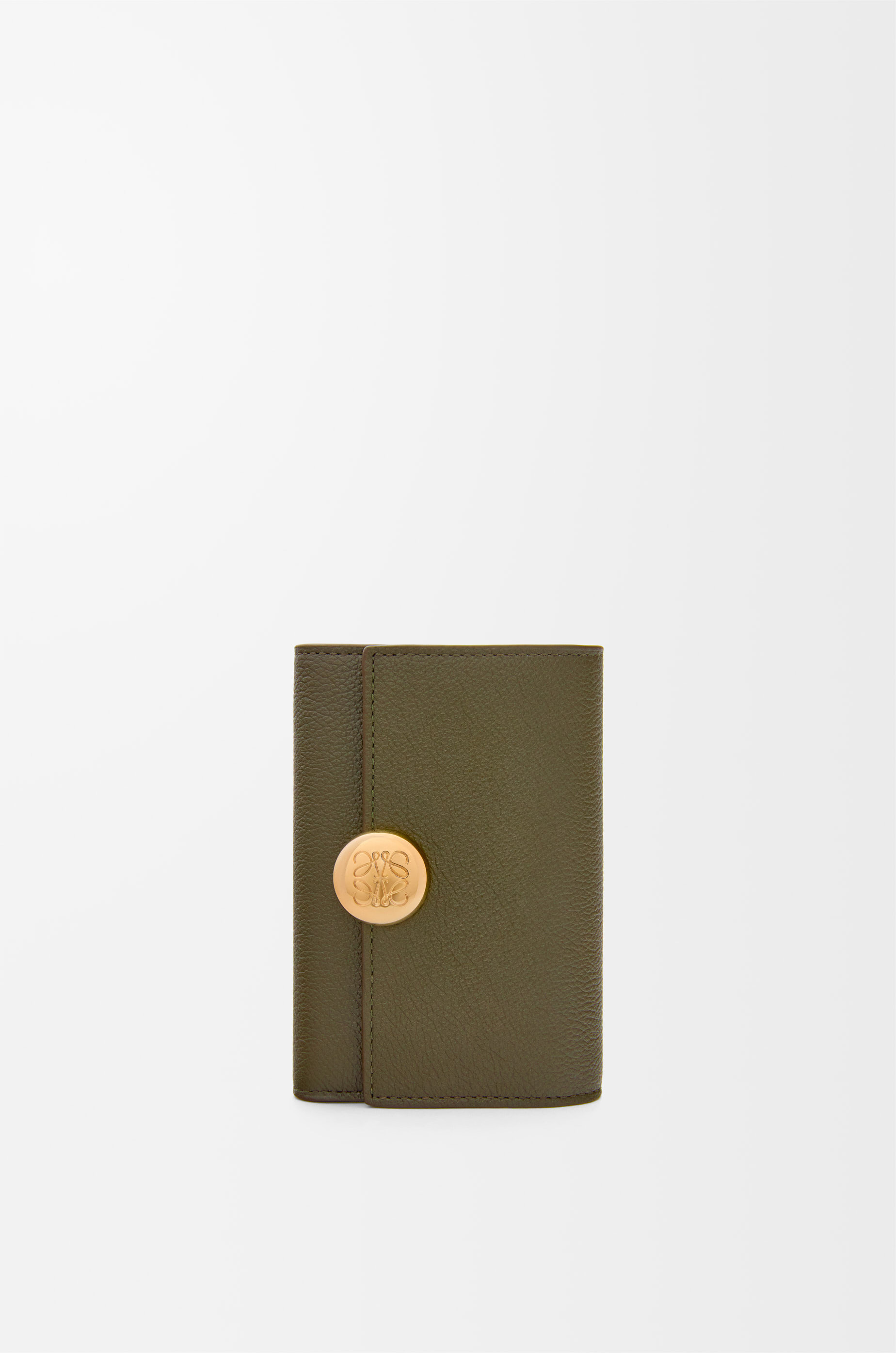 Small vertical wallet in pebble grained calfskin featuring a signature Anagram Pebble closure. - Six card slots, two small pockets, one large pocket - One zipped coin compartment - Snap button closure - Calfskin lining - Engraved Anagram Colour: Dark Khaki Green Metallic colour: Gold Main material: Mini Grain Claf Weight: 0.09 kg Height: 8.2 cm Width: 11.8 cm Depth: 3 cm Made in: Spain