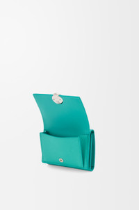 Trifold wallet in pebble grained calfskin featuring a signature Anagram Pebble closure. - Six card slots, three internal pockets - One coin compartment with snap button closure - Snap button closure - Calfskin lining - Embossed Anagram Colour: Aquamarine Metallic colour: Palladium Main material: Mini Grain Claf Weight: 0.122 kg Height: 7.8 cm Width: 10.2 cm Depth: 3.8 cm Made in: Spain