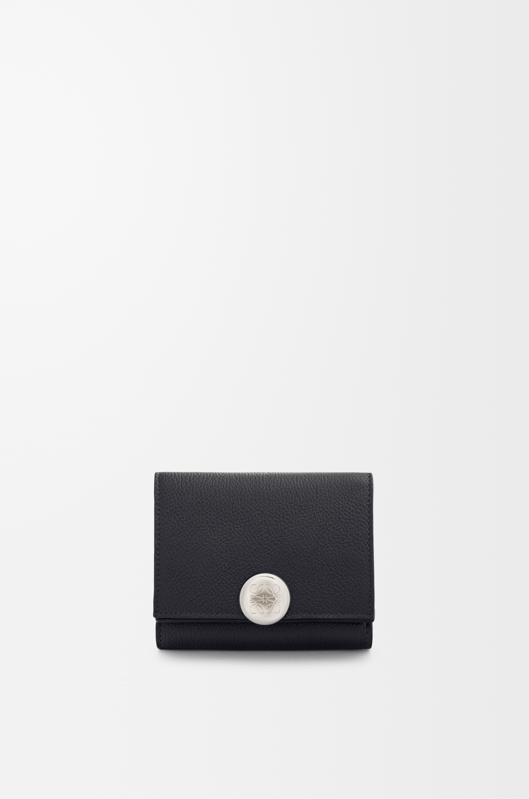Trifold wallet in pebble grained calfskin featuring a signature Anagram Pebble closure. - Six card slots, three internal pockets - One coin compartment with snap button closure - Snap button closure - Calfskin lining - Embossed Anagram Colour: Black Metallic colour: Palladium Main material: Mini Grain Claf Weight: 0.122 kg Height: 7.8 cm Width: 10.2 cm Depth: 3.8 cm Made in: Spain