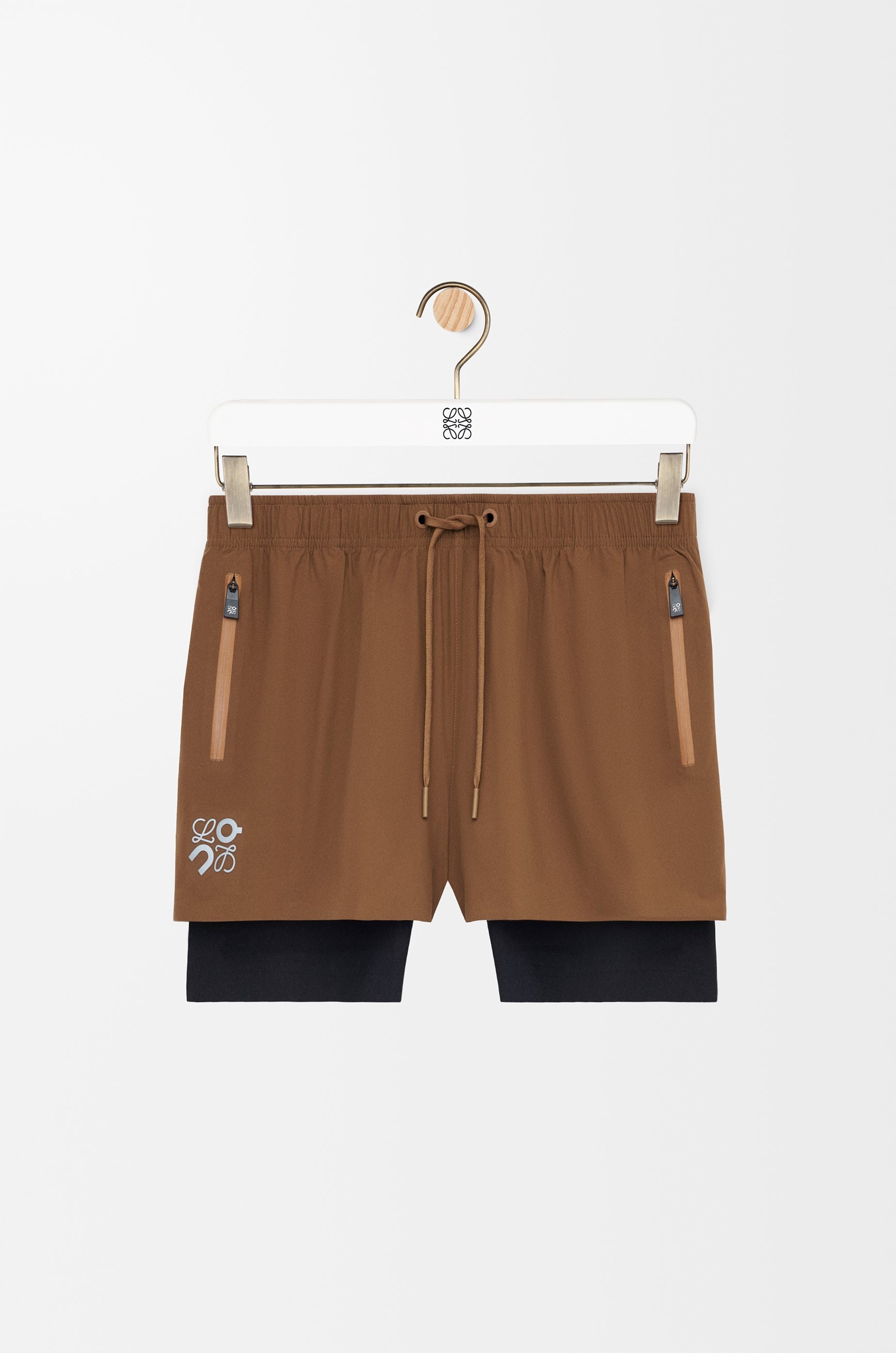 Shorts in lightweight technical shell featuring a double layer construction with built-in compression tights. - Regular fit, short length - Mid waist - Elasticated waist with drawstring - Waterproof zipped jet pockets - Reflective Anagram placed at the front - Reflective LOEWE x ON logo print placed at the back Colour: Toffee Main material: Polyester Weight: 0.2 kg Materials & care Main Material: 100% polyester