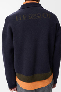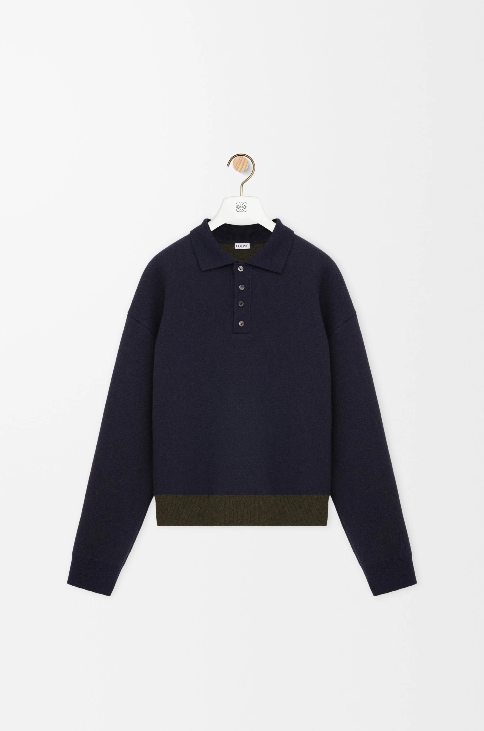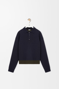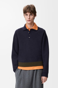Sweater in medium-weight wool featuring a Hello Anagram jacquard at the back and a contrast hem. - Regular fit, regular length - Double face stitch - Buttoned polo collar Colour: Navy Blue Main material: Wool Weight: 0.39 kg Made in: Italy Materials & care Main Material: 97% wool 3% polyamide