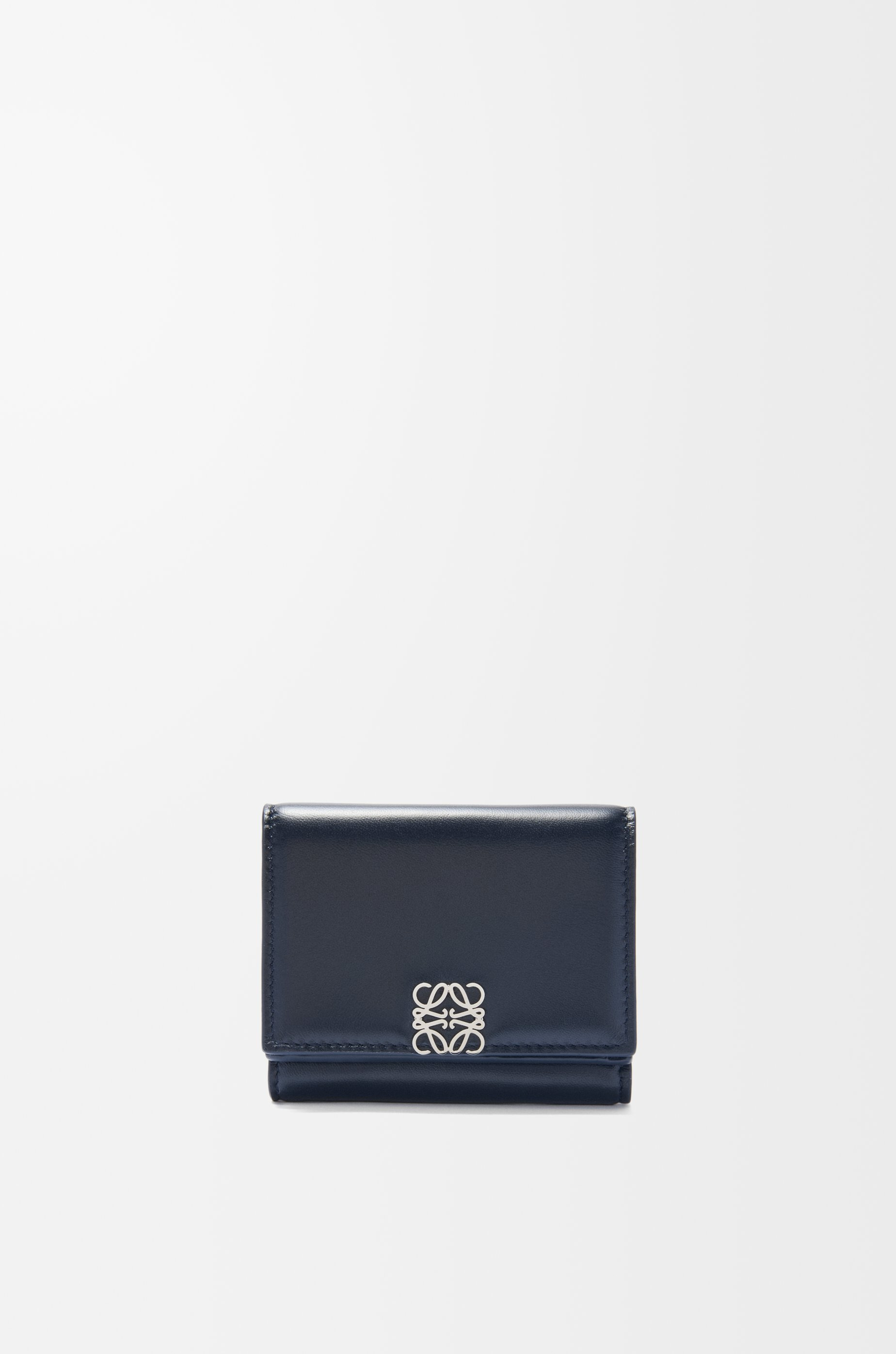 Trifold wallet in shiny nappa calfskin with a soft padded look. - Four internal pockets including one snap button pocket, six card slots - Snap button closure - Calfskin lining - Metal Anagram Details - Colour : Deep Navy - Metallic colour : Palladium - Main material : Shiny Nappa Lambskin - Weight : 0.1 kg - Height (cm) : 7.8 - Width (cm) : 10.2 - Depth (cm) : 3.8 - Height (inch) : 3.1 - Width (inch) : 4 - Depth (inch) : 1.5 - Model ID : C821TR2X10 - CIL : - 0011191707 - Made in : Spain