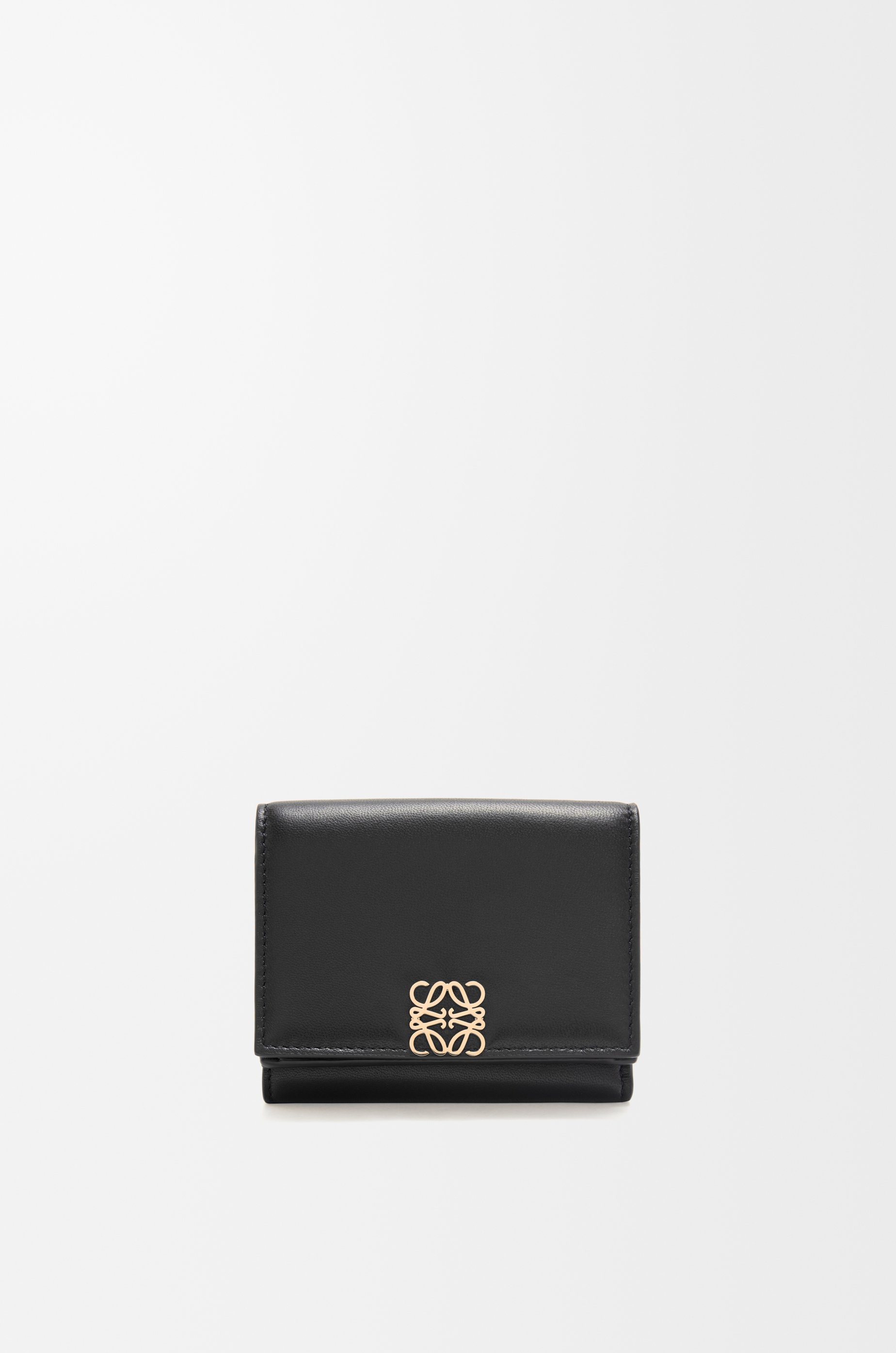 Trifold wallet in shiny nappa calfskin with a soft padded look. - Four internal pockets including a snap button pocket - Six card slots - Anagram snap button closure - Calfskin lining Details - Colour: Black - Metallic colour: Gold - Main material: Shiny Nappa Calf - Weight: 0.1 kg - Volume: SS24 W's Spring Drop 2 - Height (cm): 7.8 - Width (cm): 10.2 - Depth (cm): 3.8 - Height (inch): 3.1 - Width (inch): 4 - Depth (inch): 1.5 - Model ID: C821TR2X10 - CIL: 0010968287 - Made in: Spain