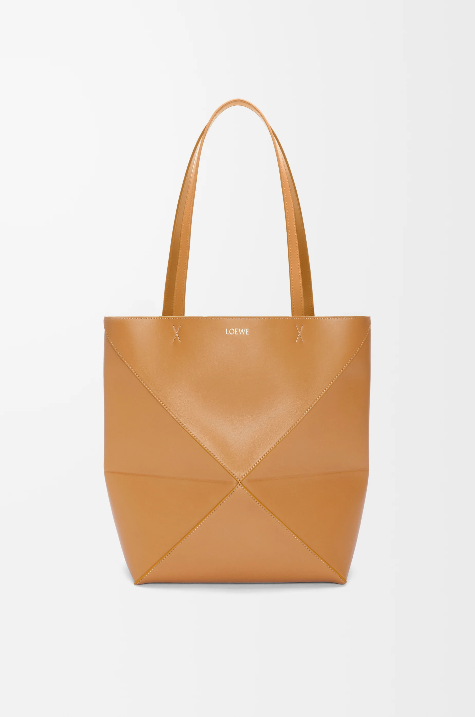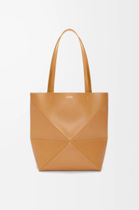The Puzzle Fold Tote takes the iconic bag’s signature geometric lines and reimagines them in graphic and architectural panels that allow the bag to fold completely flat, making it the perfect travel companion. Soft, lightweight and inventively crafted, it is finished with discreet LOEWE branding. This medium version is crafted in shiny calfskin. - Shoulder or hand carry - Suede lining - Gold embossed LOEWE Details - Colour: Warm Desert - Main material: Shiny Calf - Handle drop: 27 cm - Weight: 0.43 kg - Height (cm): 31.5 - Width (cm): 25.5 - Depth (cm): 14.5 - Height (inch): 12.4 - Width (inch): 10 - Depth (inch): 5.7 - Model ID: A657G50X01 - CIL: 0010896603 - Made in: Spain