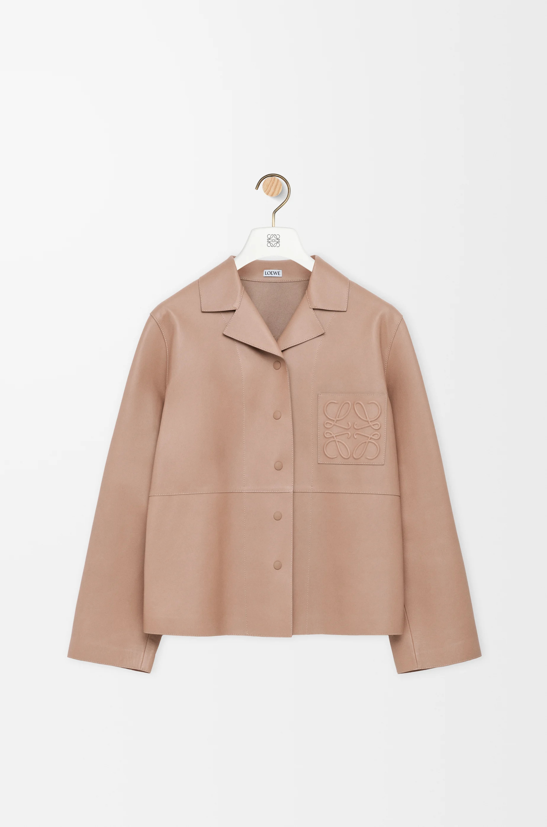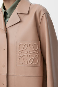 Blouse in lightweight nappa lambskin featuring an asymmetric front to back hem. - Relaxed fit, regular length - Notch lapels - Snap button front fastening - LOEWE Anagram embossed leather pocket placed on the chest Colour: Beige Main material: Nappa Weight: 0.8 kg Made in: Spain Materials & care Main Material: 100% lambskin