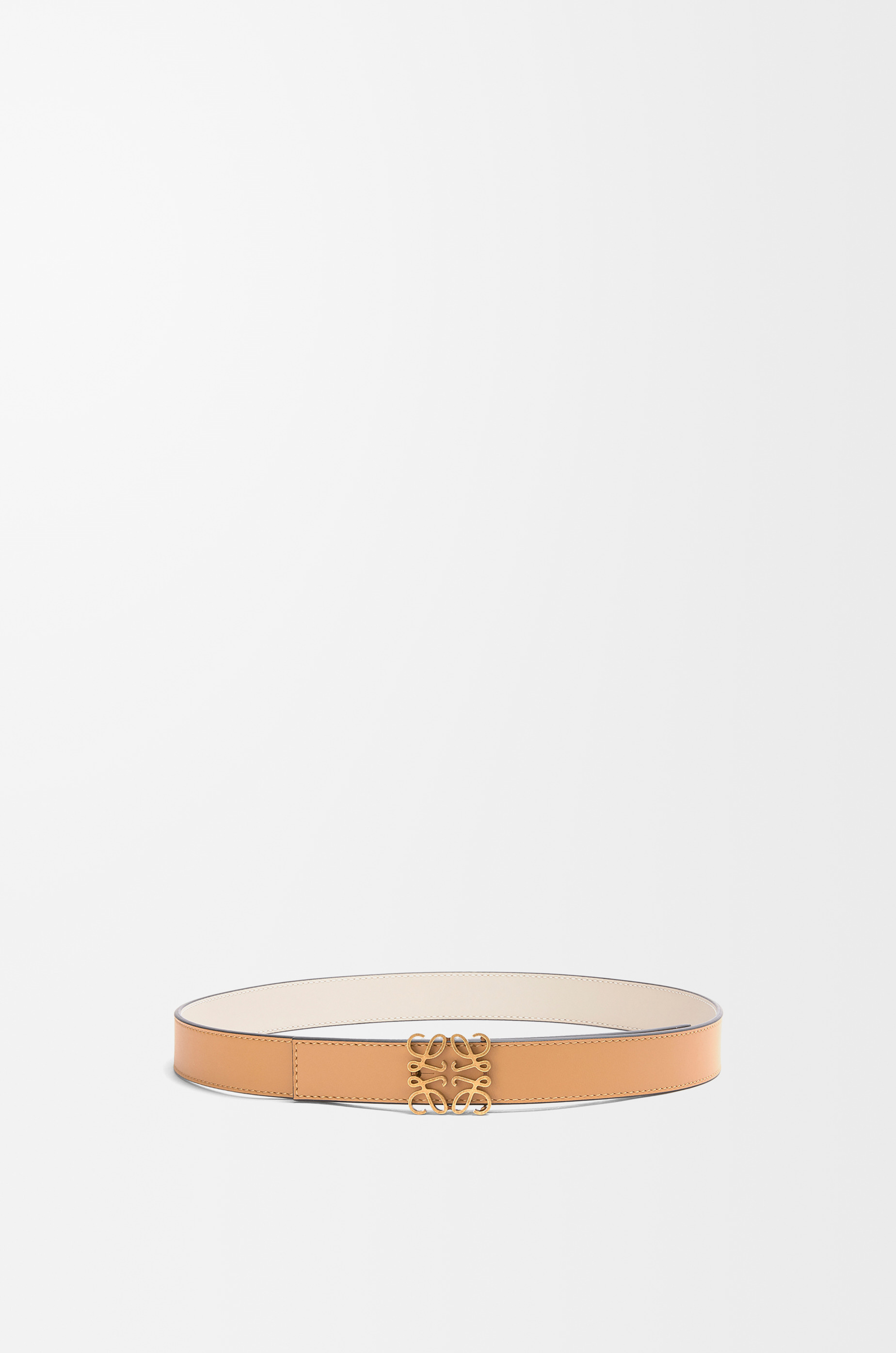 Reversible belt in smooth calfskin. - Anagram buckle - Anchor buckle - 2.8cm wide - Five holes regulation Details - Colour : Warm Desert/Light Oat/Bronze - Metallic colour : Gold - Main material : Smooth Calf - Weight : 0.08 kg - Depth (cm) : 2.8 - Depth (inch) : 1.1 - Model ID : E821Z26X03 - Made in : Spain