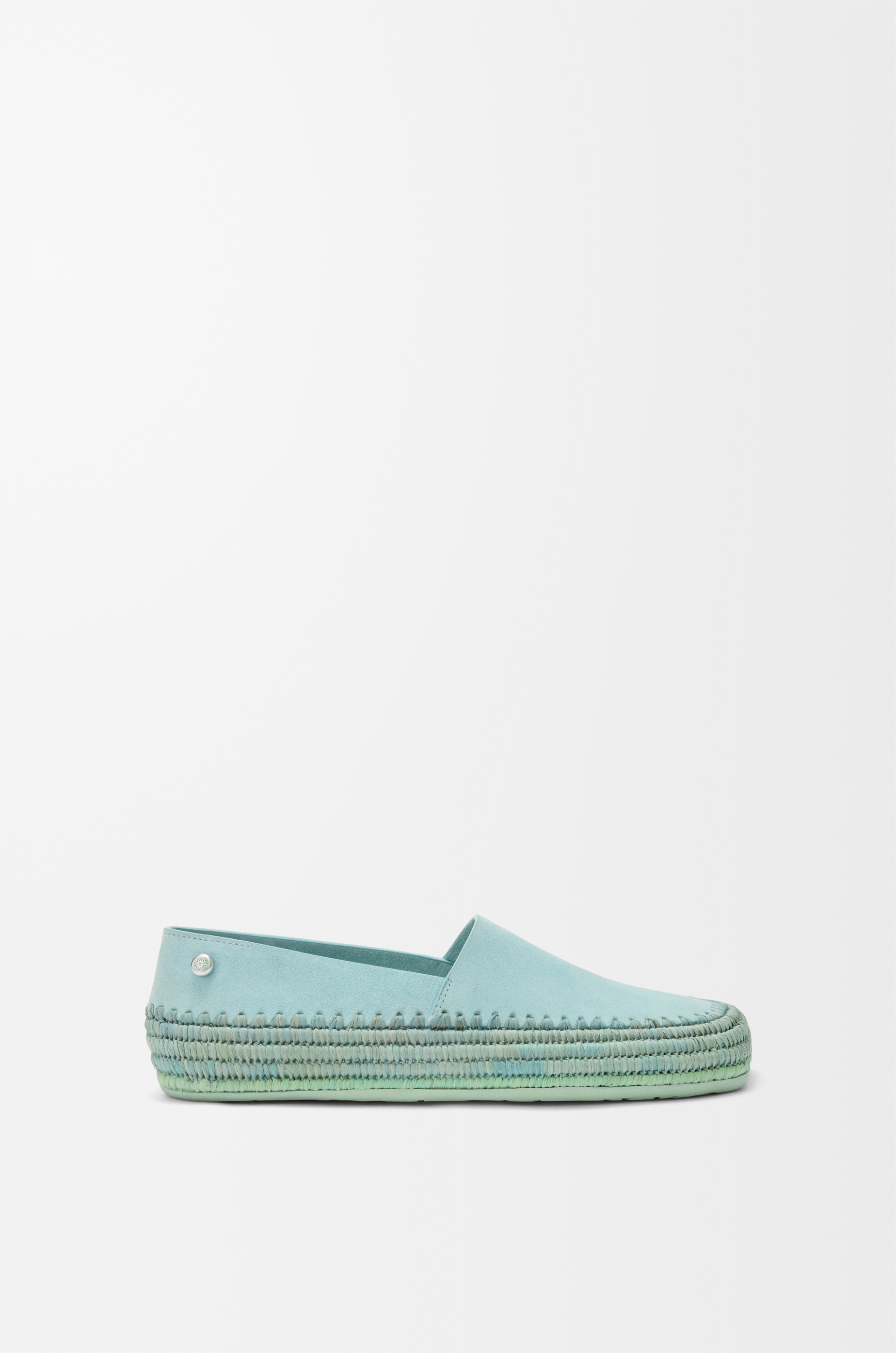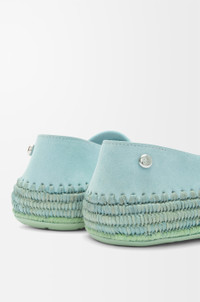 Slipper in suede featuring a hand-crafted raffia embroidery and a signature petal toe shape. - 5mm heel - Anagram Pebble at the side - Extra-padded insole - Anagram-embossed rubber outsole - Suede bonding Colour: Light Blue Main material: Suede/Raffia Weight: 0.4 kg Made in: Spain