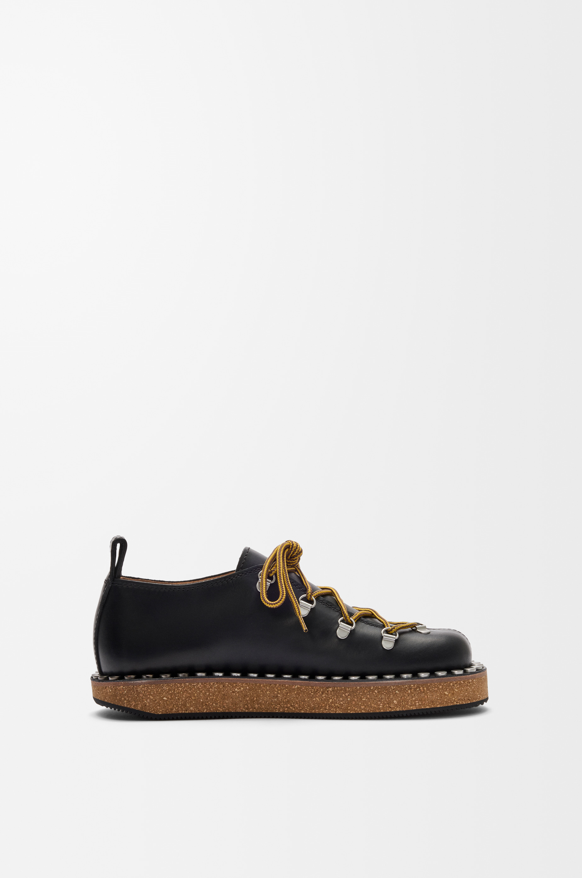 Lace-up shoe in vegetable-tanned calfskin featuring hand-applied LOEWE-engraved studs and hiking boot-inspired hooks and laces. - 25mm heel - Lace closure - Ergonomic insole, cork-covered midsole, rubber outsole Colour: Black Main material: Vegetal Calf Weight: 1.3 kg Made in: Italy