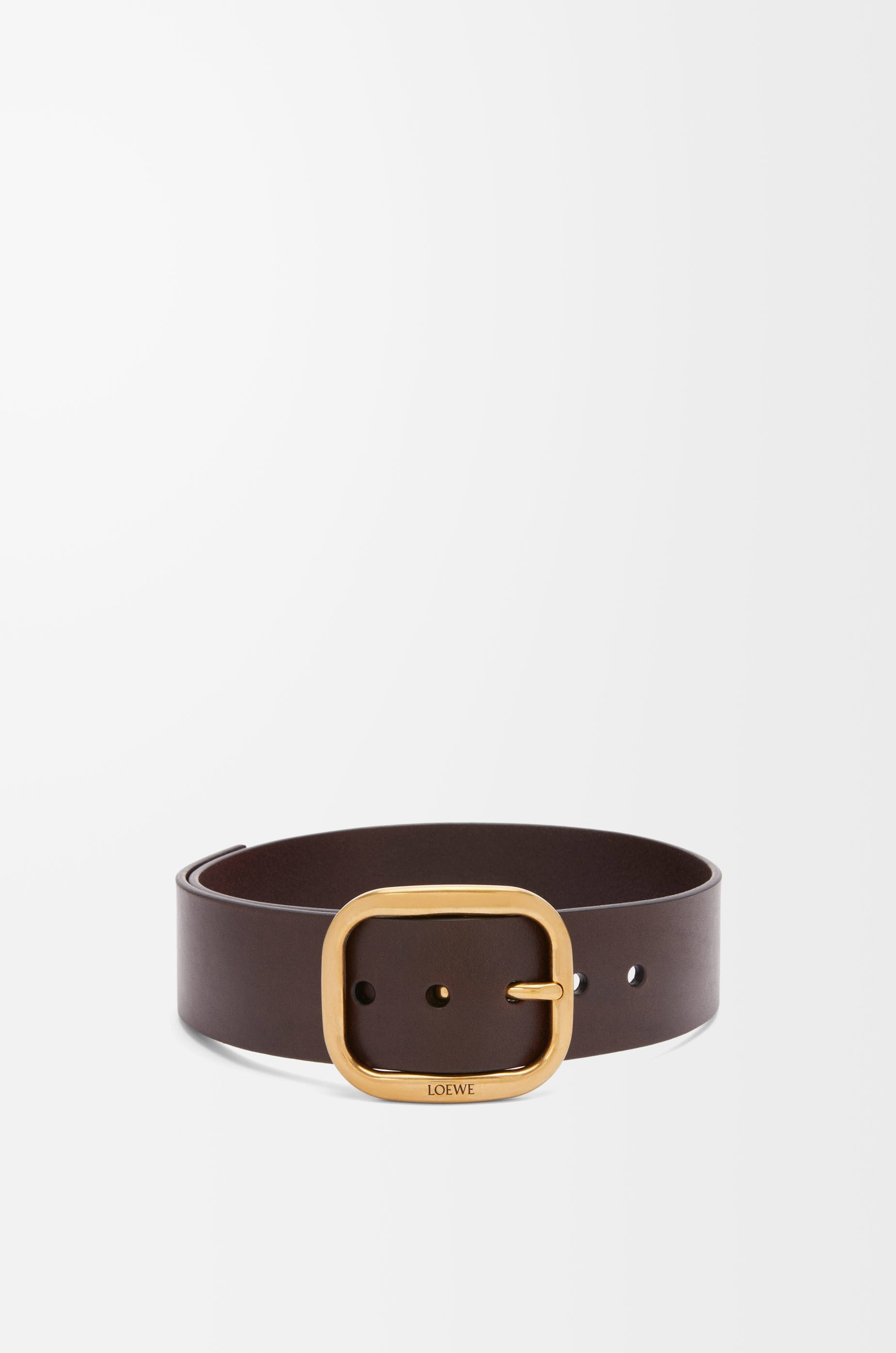 Rounded soft belt in vegetable-tanned calfskin. Due to its treatment, this leather will age naturally and develop a unique patina over time. - Rounded buckle - Pin buckle - 5cm wide - Five holes regulation - Engraved LOEWE Details - Colour : Dark Brown - Metallic colour : Gold - Main material : Classic Calf - Weight : 0.3 kg - Depth (cm) : 5 - Depth (inch) : 2 - Model ID : E619244XAI - Made in : Spain