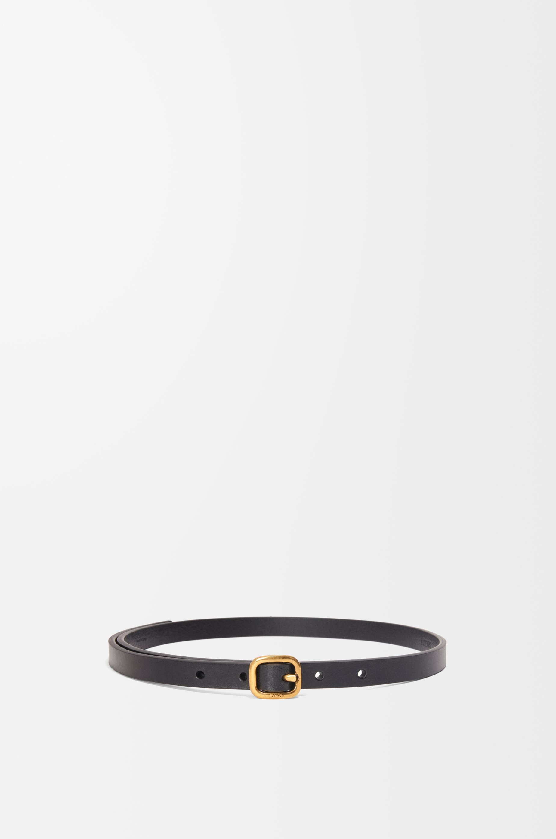 Rounded soft belt in vegetable-tanned classic calfskin with a LOEWE engraved buckle. - Due to its treatment, this leather will age naturally and develop a unique patina over time. - 1.5cm wide - Five holes regulation Details - Colour : Black - Metallic colour : Gold - Main material : Classic Calf - Weight : 0.08 kg - Height (cm) : 0.3 - Width (cm) : 93 - Depth (cm) : 1.5 - Height (inch) : 0.1 - Width (inch) : 36.6 - Depth (inch) : 0.6 - Model ID : E619Z16X18 - Made in : Spain