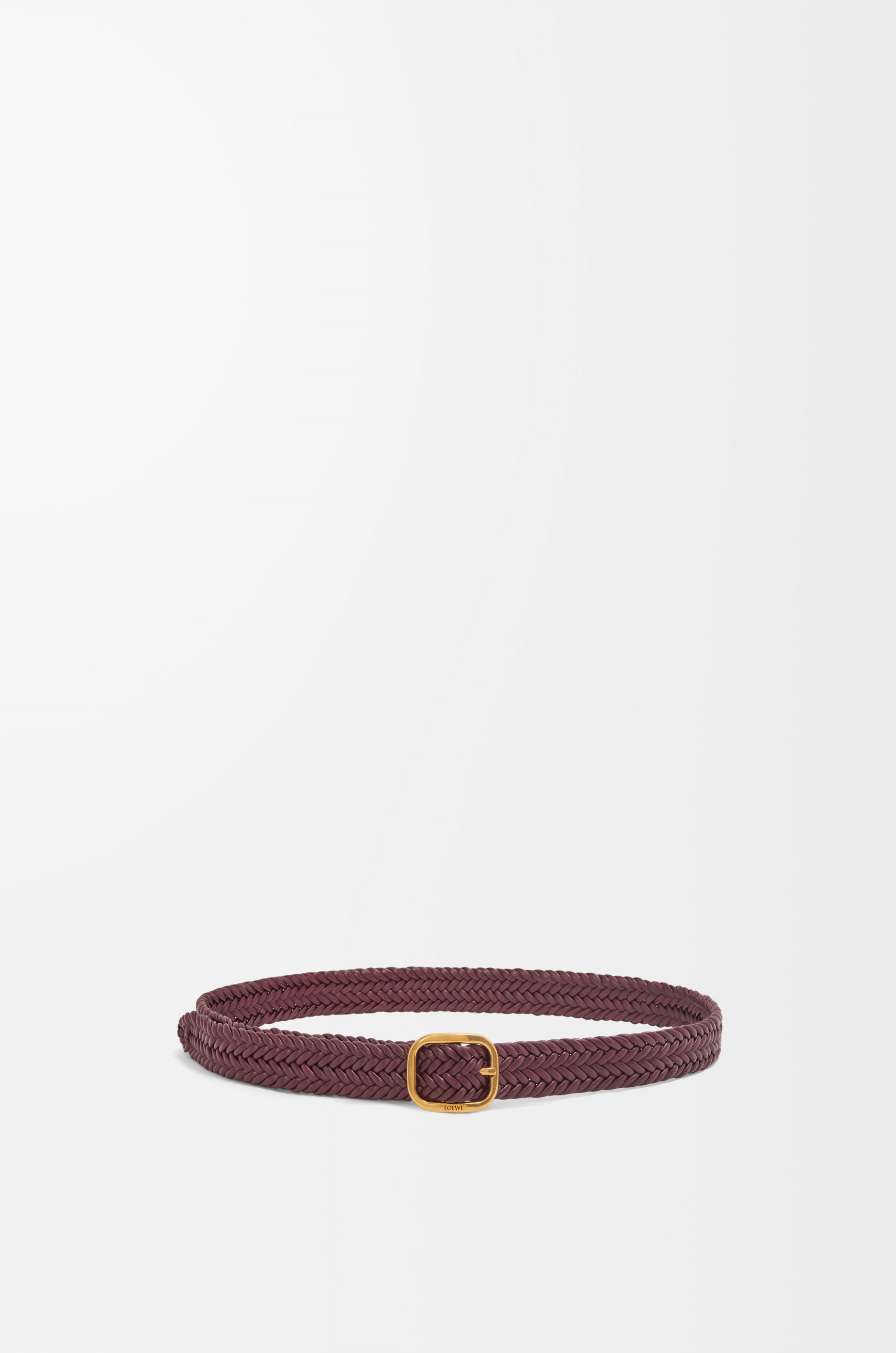 Rounded soft belt in handwoven calfskin with a vintage brass-effect LOEWE engraved buckle. - 3.5cm wide Details - Colour : Burgundy/Gold - Metallic colour : Gold - Main material : Calf - Weight : 0.16 kg - Depth (cm) : 3.5 - Depth (inch) : 1.4 - Model ID : E619Z20X68 - Made in : Spain