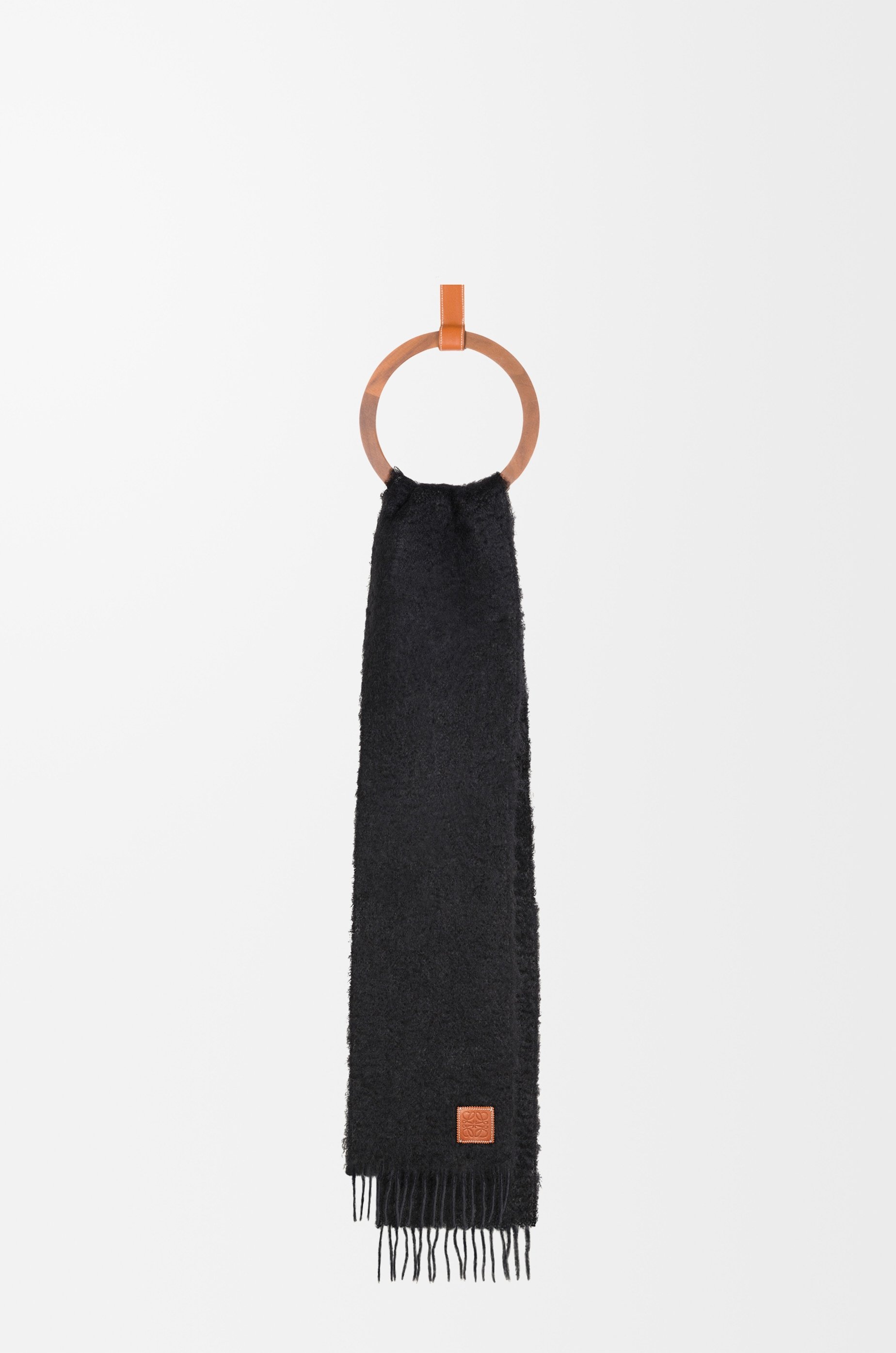 Scarf crafted in medium-weight mohair and wool blend. - 23cm x 185cm - Fringed edges - LOEWE Anagram embossed leather pach placed on the corner Details - Colour: Black - Metallic colour: Palladium - Main material: Mohair/Wool#calfskin - Weight: 0.2 kg - Height (cm): 23 - Width (cm): 185 - Height (inch): 9.1 - Width (inch): 72.8 - Model ID: F655254X01 - CIL: 0010492981 - Made in: Spain