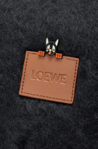 Scarf in medium-weight mohair and wool blend featuring a Futurist cat enamel and brass pin. This scarf is inspired by Louis Wain's "Futurist Cats" porcelain vase series. - 23cm x 185cm - Fringed edges - LOEWE embossed leather patch placed on the corner Colour: Black Main material: Mohair/wool/polyamide Weight: 0.225 kg Made in: Spain