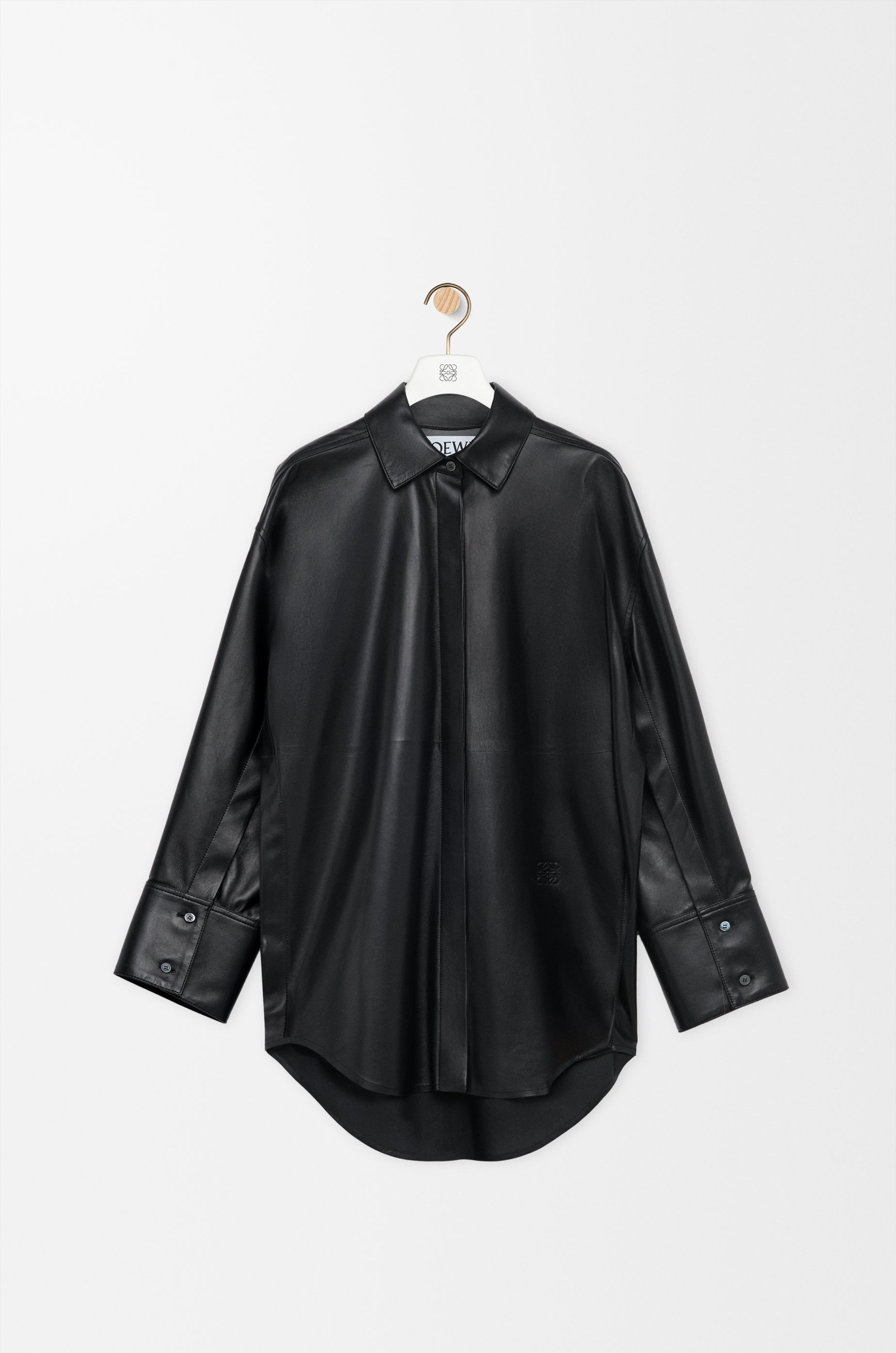 Shirt in ultra-lightweight nappa lambskin featuring an adjustable silhouette via buttoned sides and sleeves. - Relaxed fit, long length - Classic collar - Concealed button front fastening, buttoned cuffs - Anagram embroidery placed at the back - Unlined Colour: Black Main material: Nappa Weight: 0.5 kg Made in: Spain Materials & care Main Material: 100% lambskin