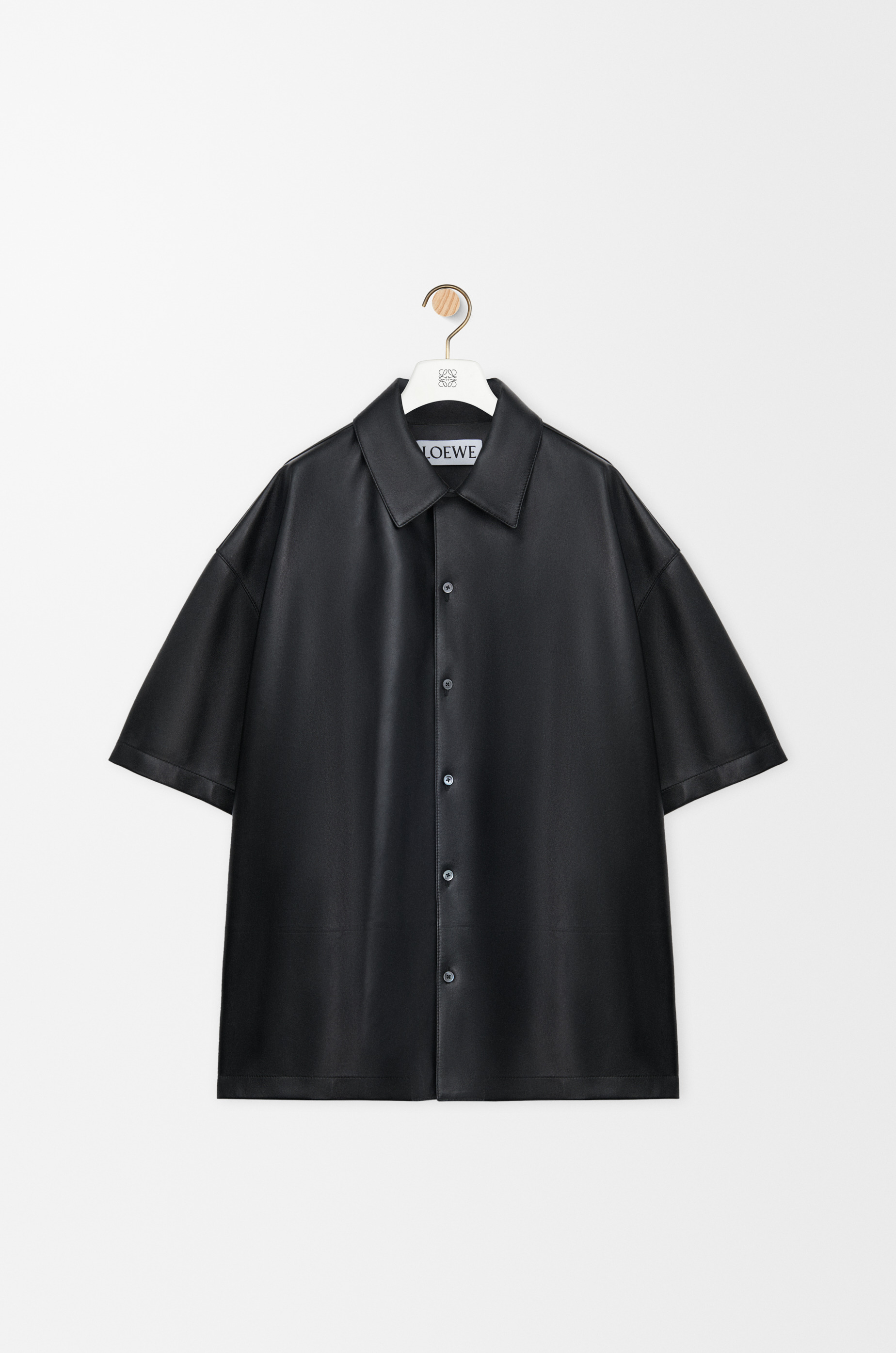 Shirt in lightweight soft nappa lambskin. - Relaxed fit, regular length - Camp collar - Button front fastening - Unlined - Embossed Anagram placed at the back Colour: Black Main material: Nappa Weight: 0.6 kg Made in: Spain Materials & care Main Material: 100% lambskin