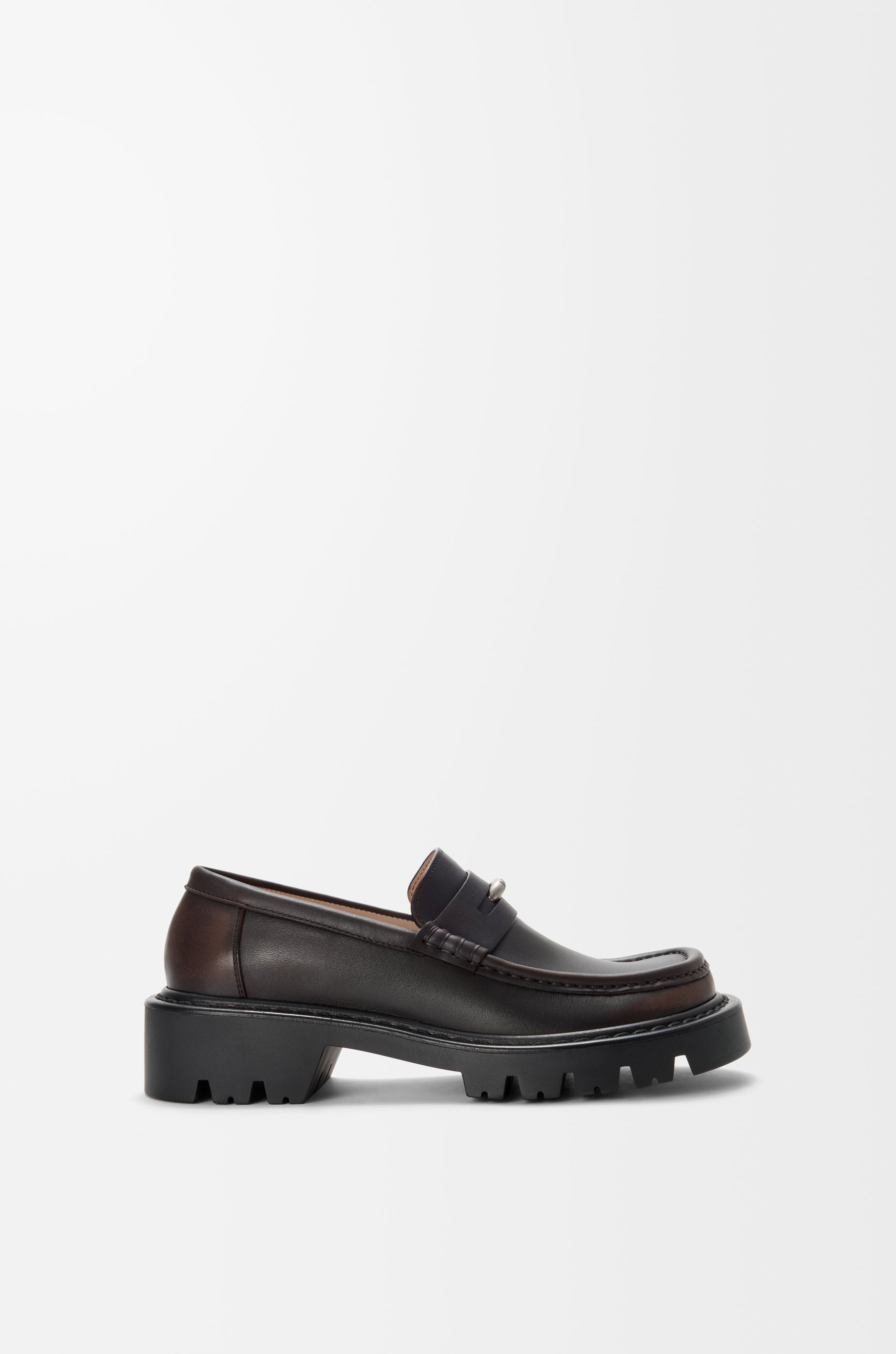 Loafer in brushed-off calfskin featuring a bulky toe shape, a thick rubber lug sole and a metal donut detail on the vamp. - 40mm sole - Engraved LOEWE on the half donut on the vamp Colour: Dark Brown Main material: Brushed Off Calf Weight: 1.2 kg Made in: Italy