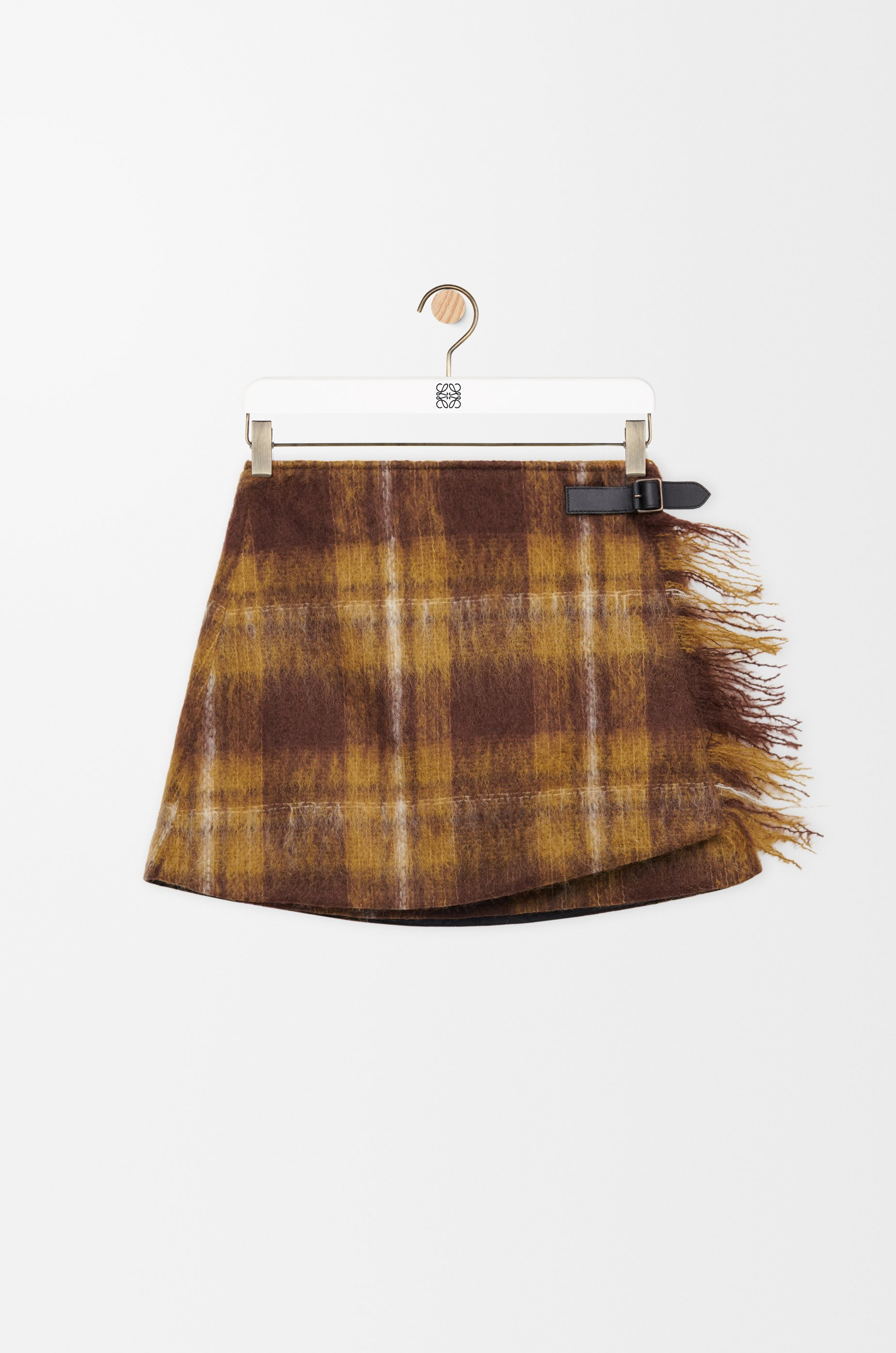 Skirt in medium-weight mohair and wool blend featuring an allover check pattern and a wrap construction with a leather belt detail and fringes at the front. - Regular fit, short length - Mid waist - Concealed button fastening - Fully lined Colour: Yellow/Multicolor Main material: Mohair/Wool/Polyamide Weight: 0.25 kg Made in: Italy Materials & care Main Material: 64% mohair 31% wool 5% polyamide