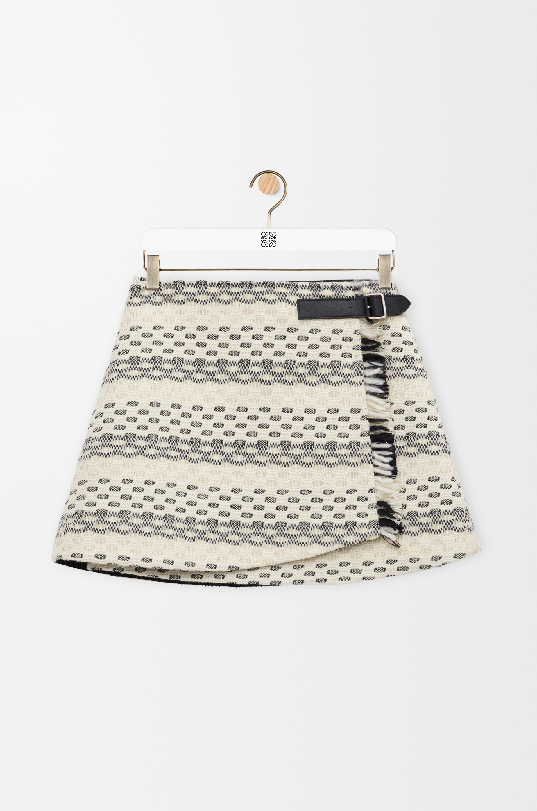 Skirt in medium-weight wool blend jacquard inspired by Anni Albers's "Fringes" tapestry featuring a wrap construction with a leather belt detail and fringes at the front. This skirt is part of the LOEWE x Albers collection. - Regular fit, short length - Mid waist - Concealed button fastening - Fully lined Colour: Black/White Main material: Wool/Viscose/Polyamide Weight: 0.4 kg Made in: Italy Materials & care Main Material: 69% wool 26% viscose 4% mohair 1% polyamide