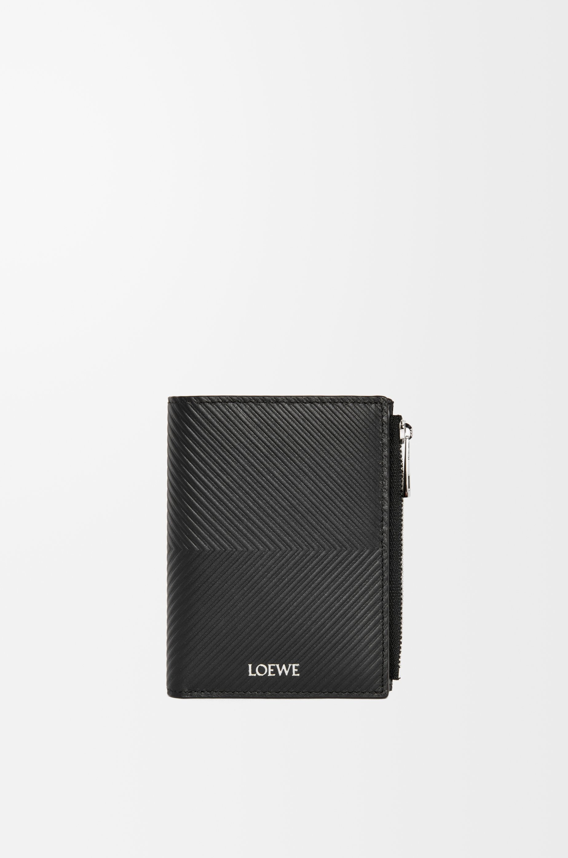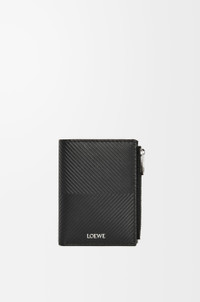 Slim compact wallet in classic calfskin embossed with a chevron pattern. - Zip coin compartment - Calfskin zip pull - Snap button closure - Six card slots, four slip pockets and one larger pocket for notes - Calfskin lining - Silver embossed LOEWE Details - Colour: Black - Metallic colour: Palladium - Main material: Classic Calf - Weight: 0.09 kg - Height (cm): 11.8 - Width (cm): 9.3 - Depth (cm): 1 - Height (inch): 4.6 - Width (inch): 3.7 - Depth (inch): 0.4 - Model ID: C779W73X01 - CIL: 0011110434 - Made in: Spain