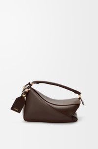 The Featherlight Puzzle is defined by its distinctive geometric lines and its cuboid form. The supple featherlight nappa makes the bag soft and slouchy. - Shoulder, crossbody or hand carry - Detachable and adjustable strap with rotating dogclips - Zip closure with articulated pull - One external zipped rear pocket, one internal slip pocket - Detachable LOEWE gold or silver embossed tag with secret pocket and balloon dice - Baguette-shaped metal feet - Nappa lambskin lining - Embossed Anagram, LOEWE engraved internal plaque Colour: Dark Brownie Metallic colour: Gold Main material: Featherlight Nappa Lambskin Strap length: 92 -112 cm Strap drop: 46 - 56 cm Handle drop: 7 cm Weight: 0.5 kg Height: 16.5 cm Width: 24 cm Depth: 10.5 cm Made in: Spain