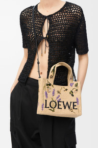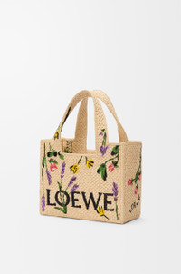 The LOEWE Font tote is a cuboid bag with a contrasting LOEWE signature. It is made in Spain using raffia palm leaves cultivated and handwoven by artisans in Madagascar. This small version features one-of-a-kind hand-embroidered flowers. - Shoulder, crossbody or hand carry - Detachable and adjustable strap - Unlined Colour: Natural Metallic colour: Gold Main material: Raffia Strap length: 107 - 117 cm Strap drop: 52 - 57 cm Handle drop: 16 cm Weight: 0.38 kg Height: 19.5 cm Width: 24 cm Depth: 11 cm
