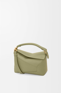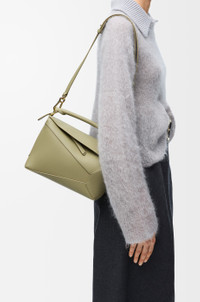 The Puzzle bag is the debut bag for LOEWE by Creative Director Jonathan Anderson. A cuboid shape and precise cutting technique create Puzzle’s distinctive geometric lines. This small version is crafted in classic calfskin. - Shoulder, crossbody or hand carry - Detachable and adjustable strap, top handle - Zip closure with calfskin puller - External zip rear pocket, internal slip pocket - Herringbone cotton canvas lining - Embossed Anagram Details - Colour : Eucalyptus Green - Metallic colour : Gold - Main material : Classic Calf - Strap length : 80.5 - 115.5 cm - Strap drop : 40 - 58 cm - Handle drop : 7 cm - Weight : 0.52 kg - Height (cm) : 16.5 - Width (cm) : 24 - Depth (cm) : 10.5 - Height (inch) : 6.5 - Width (inch) : 9.4 - Depth (inch) : 4.1 - Model ID : A510P60X41 - CIL : - 0011182102 - Made in : Spain